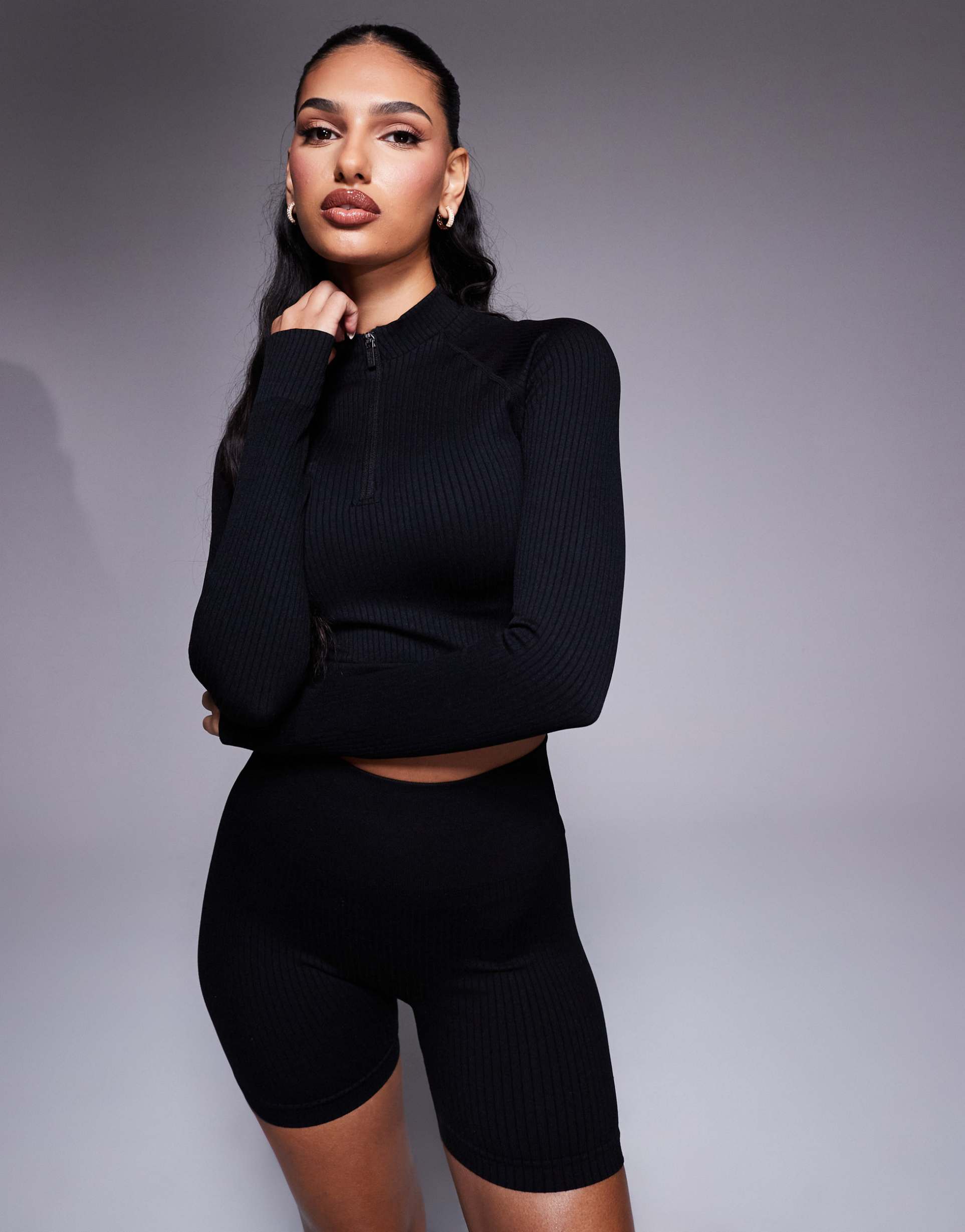 ASOS 4505 ICON SEAMLESS RIBBED 1/4 ZIP LONG SLEEVE TOP IN BLACK