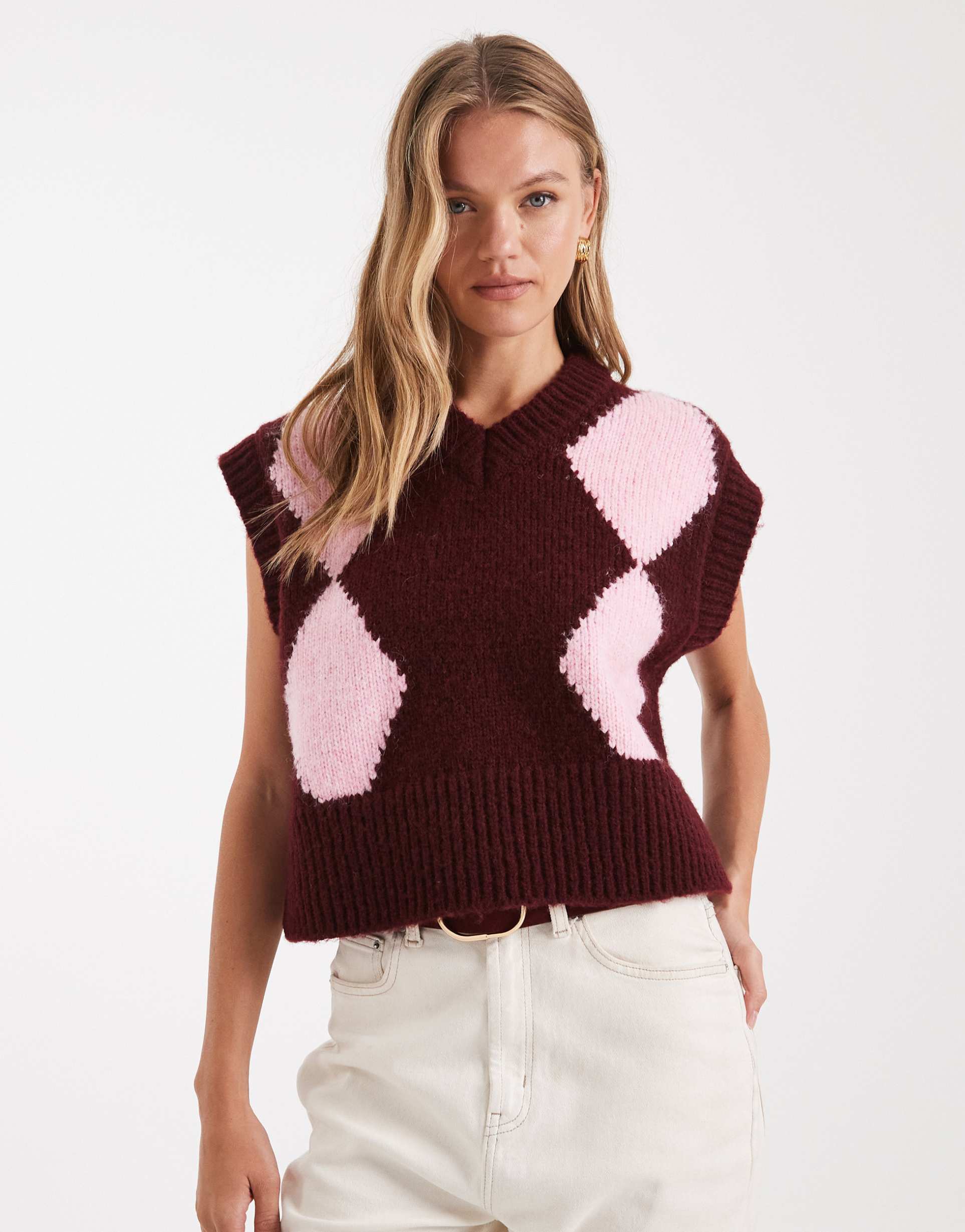 ASOS DESIGN ARGYLE BOXY FLUFFY V-NECK TANK TOP IN BURGUNDY