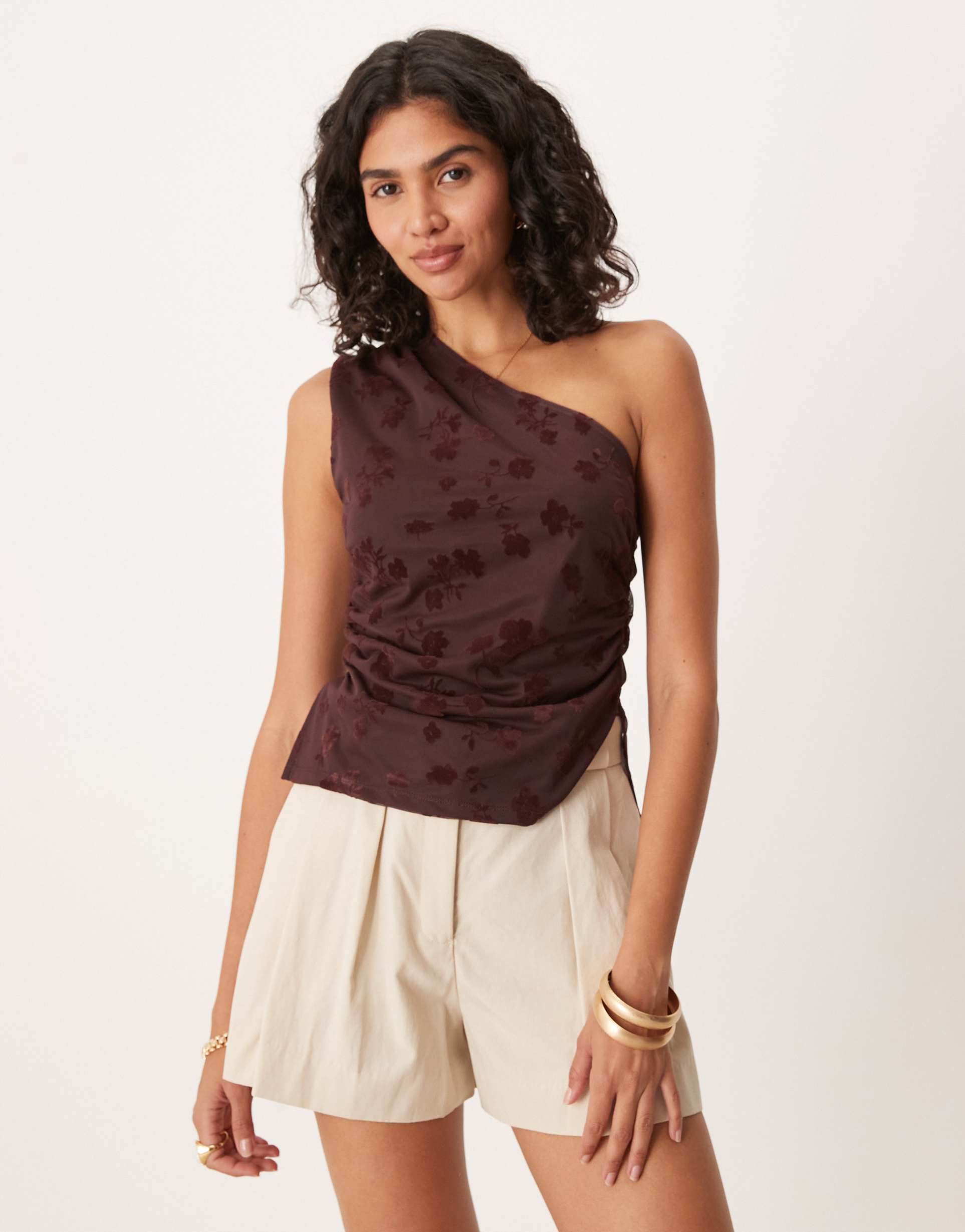 ASOS DESIGN ASYMMETRIC DRAPED FLOCKED BURN OUT FLORAL SHEER TOP IN BROWN