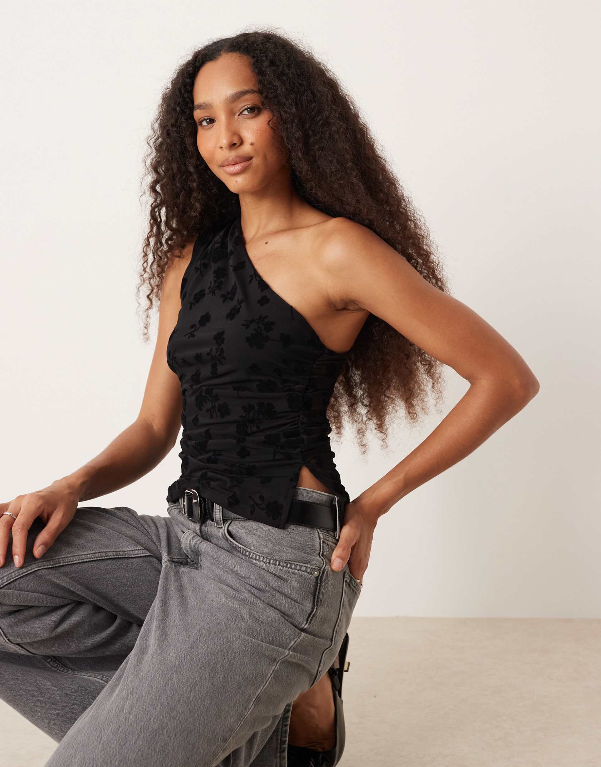 Delicate sheer mesh meets a flocked floral pattern in this asymmetric top that beautifully contours the body with its slim fit. The one-shoulder strap and sleeveless cut lend a modern, sexy vibe, while the waist length hem ensures versatile styling options. Crafted from fine, soft cotton mesh, this breathable black top is ideal for spring and summer days. Perfect for casual outings, date nights, or lively evenings out, it blends comfort and edgy style effortlessly for a standout look.