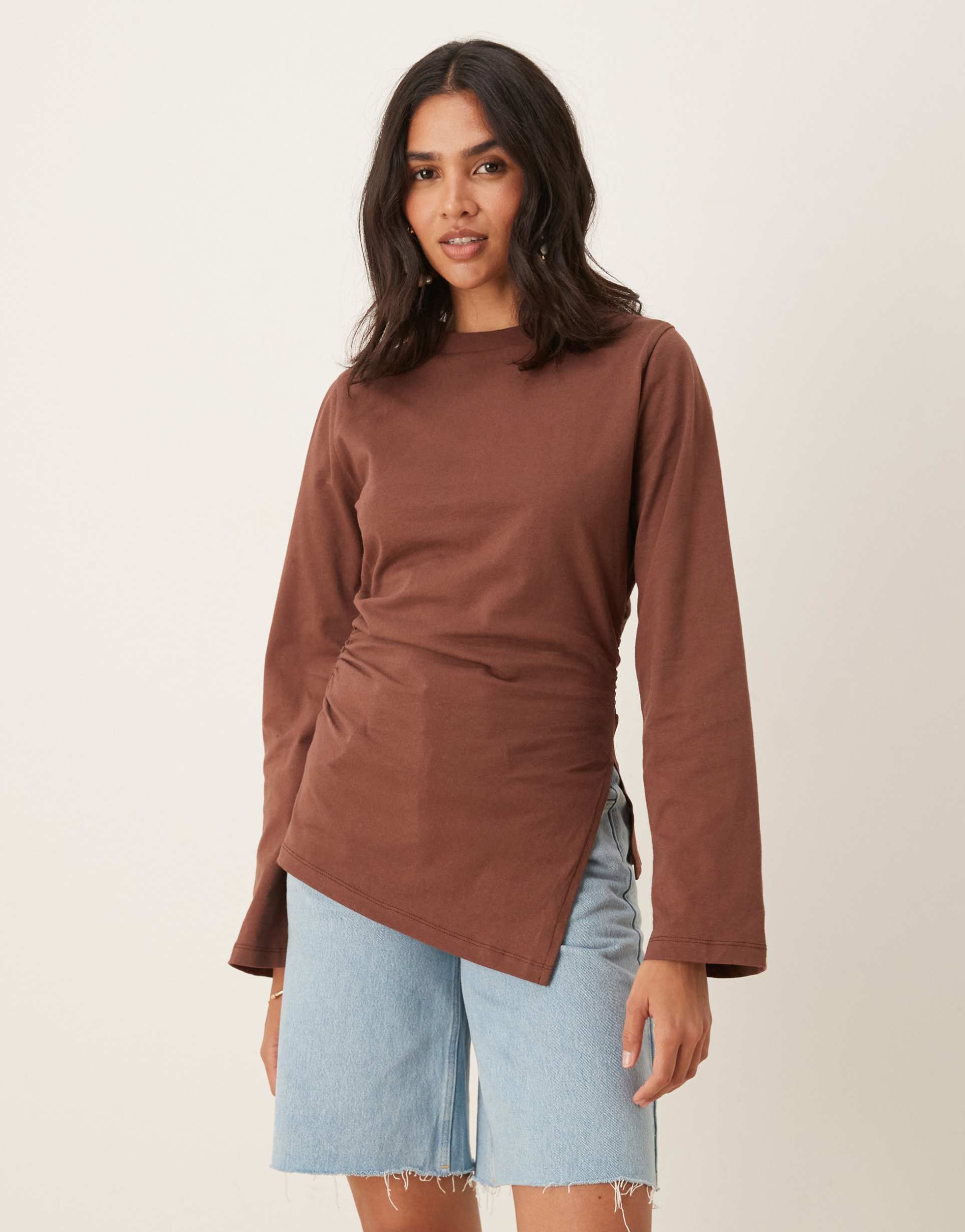 ASOS DESIGN ASYMMETRIC HEM LONG SLEEVE RUCHED SIDE TOP IN BROWN