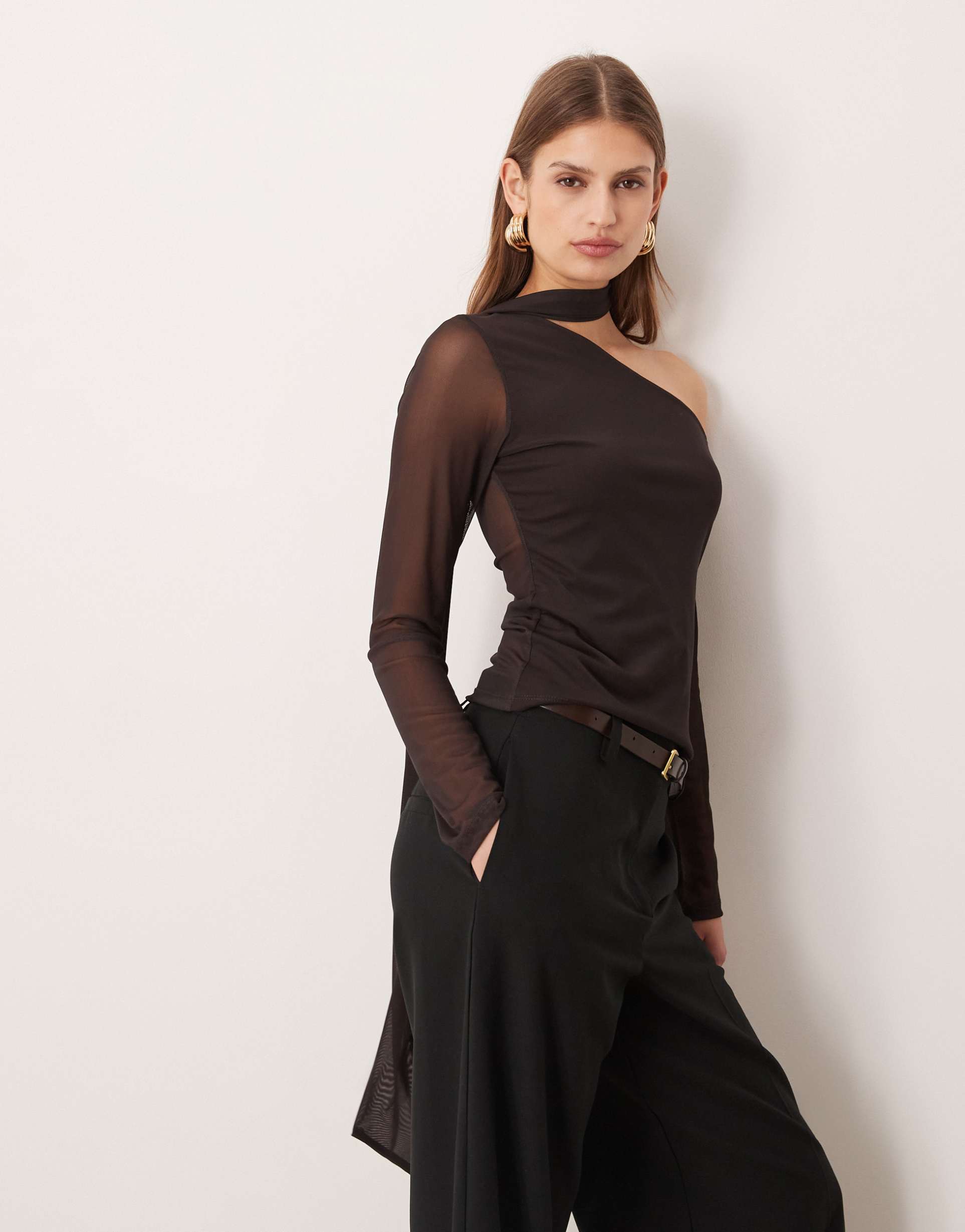 Modern elegance meets edgy style in this asymmetric mesh top in matte brown. Crafted from fine, stretchy, and sheer mesh with a soft cotton base, it features a striking one-shoulder neckline and long regular sleeves for a balanced silhouette. The hip-length cut and scarf detail add unique flair, perfect for casual outings, streetwear vibes, or night out events. Its regular fit ensures comfort while the sheer panels and scarf accentuate a contemporary, chic look that transitions effortlessly through autumn and winter seasons.
