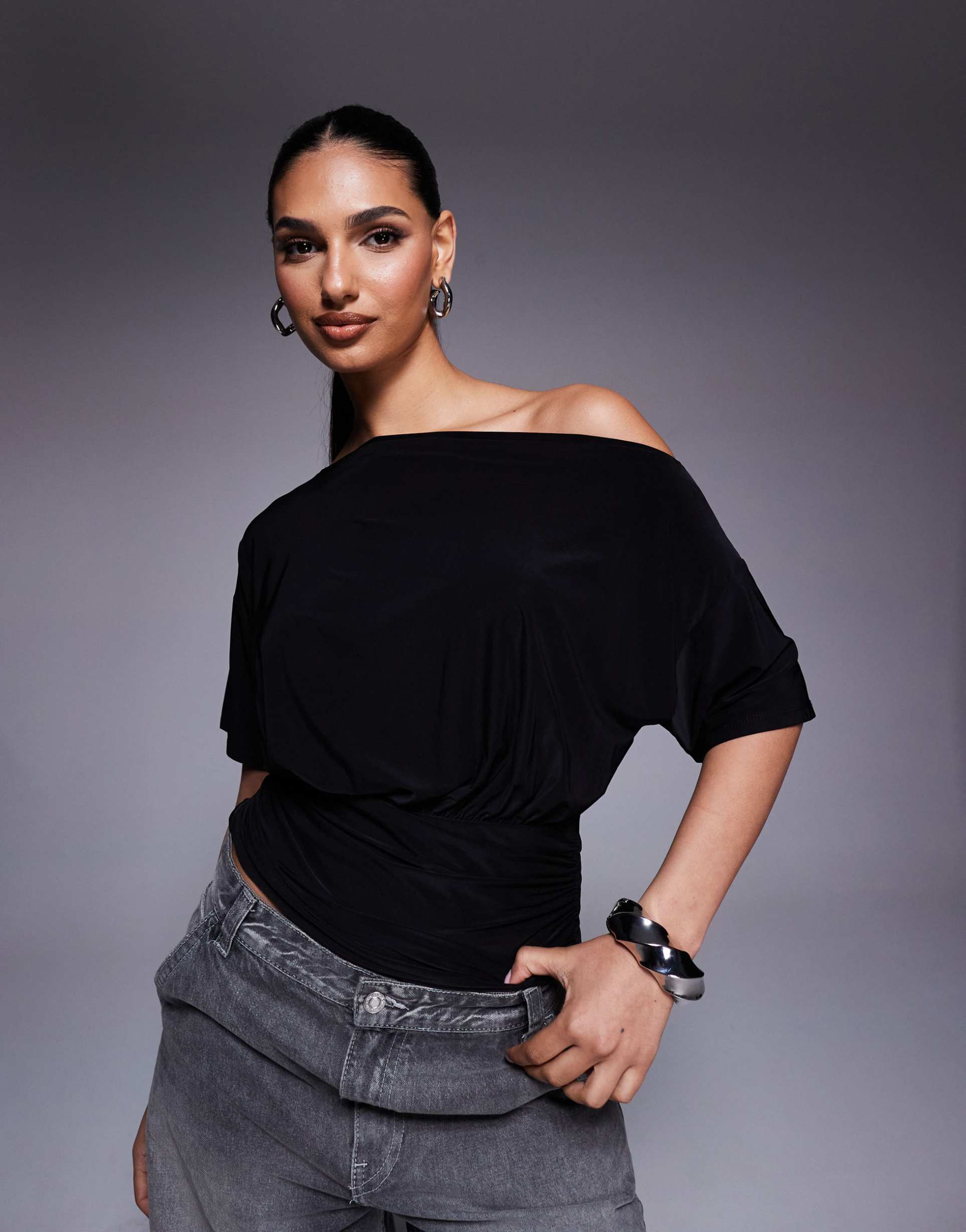 ASOS DESIGN ASYMMETRIC ONE-SHOULDER SHORT SLEEVE TOP WITH CINCH WAIST DETAIL IN BLACK