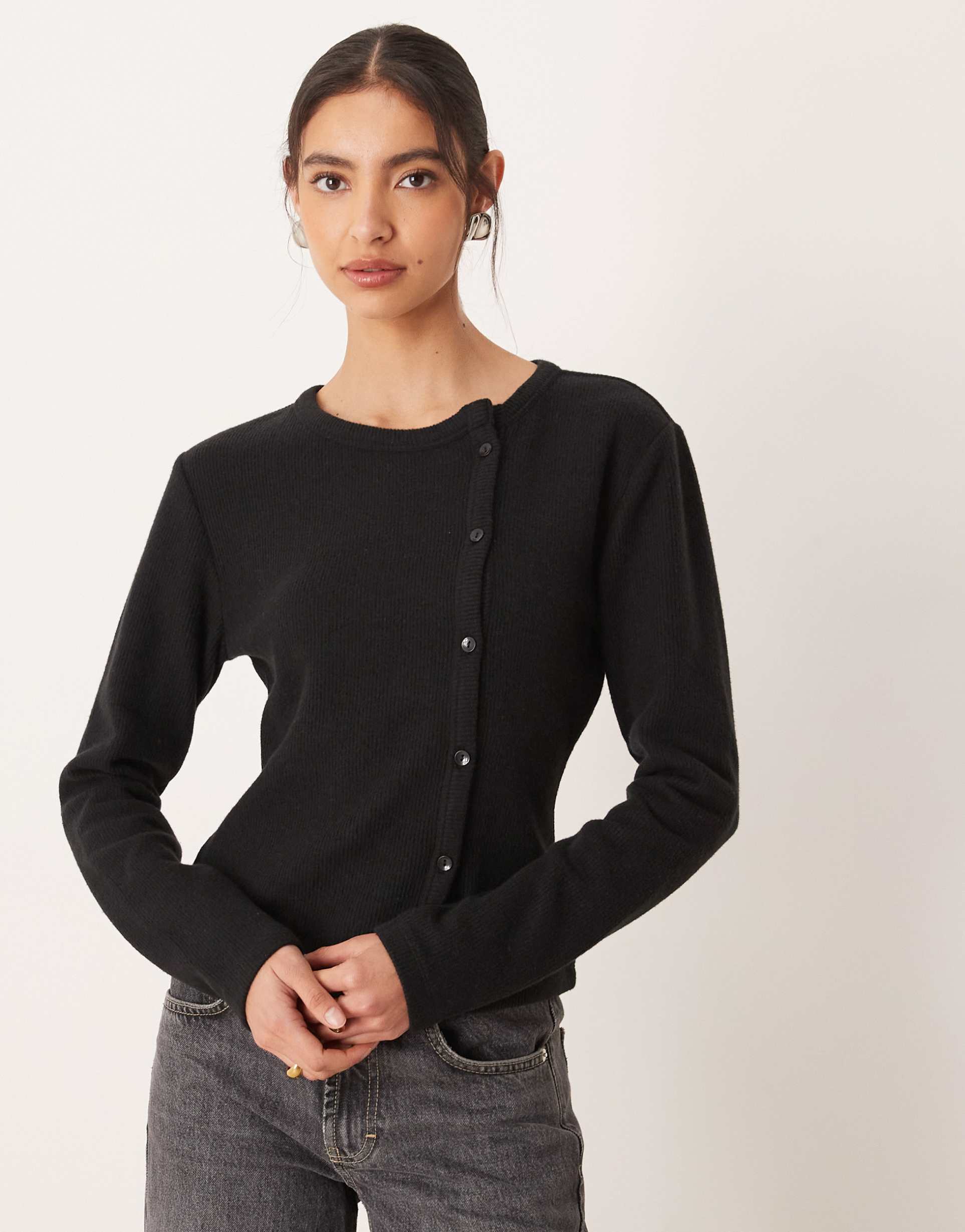 ASOS DESIGN ASYMMETRIC PLACKET BUTTON UP SUPER SOFT TOP IN BLACK