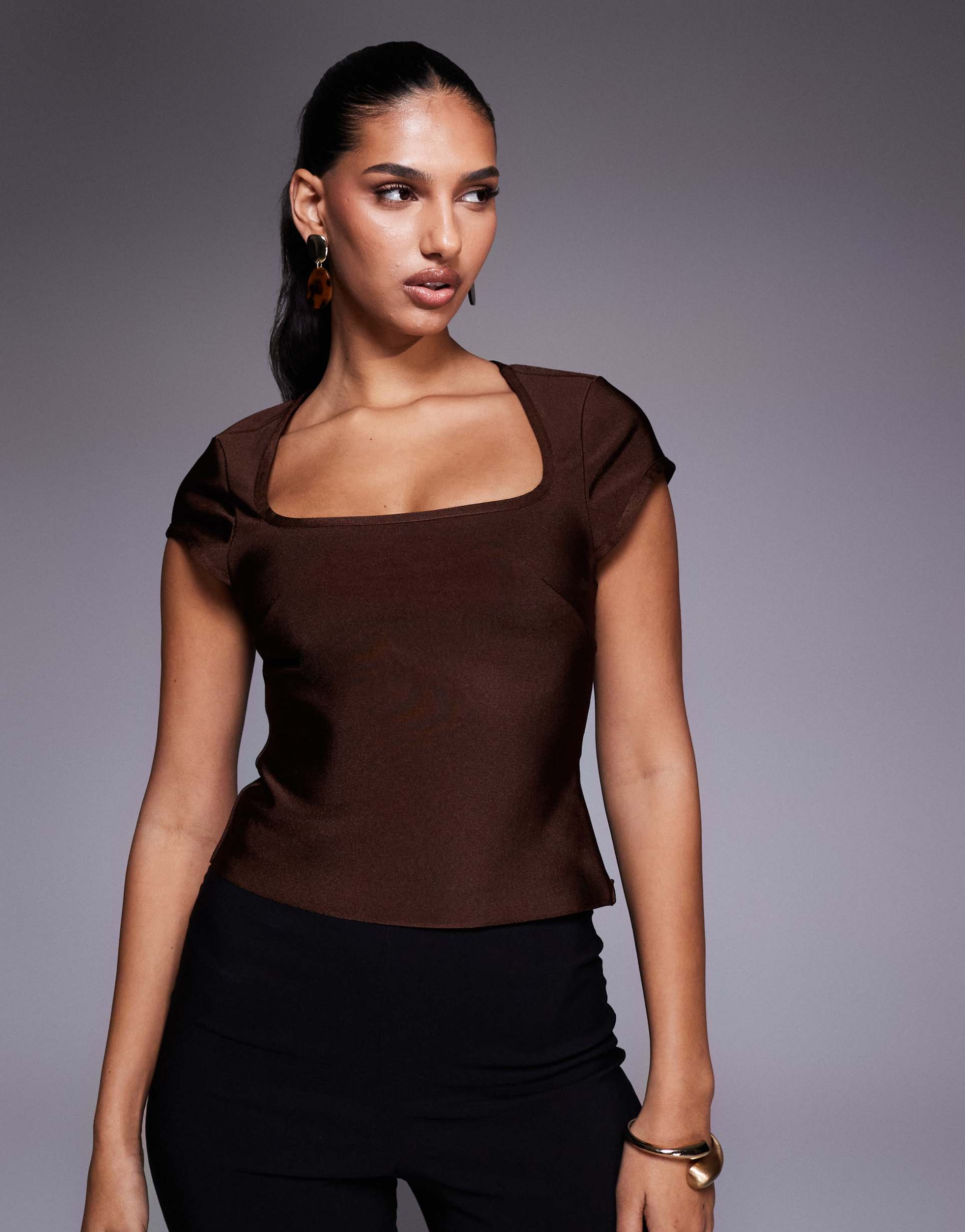ASOS DESIGN BANDAGE CAP SLEEVE SQUARE NECK TOP IN CHOCOLATE