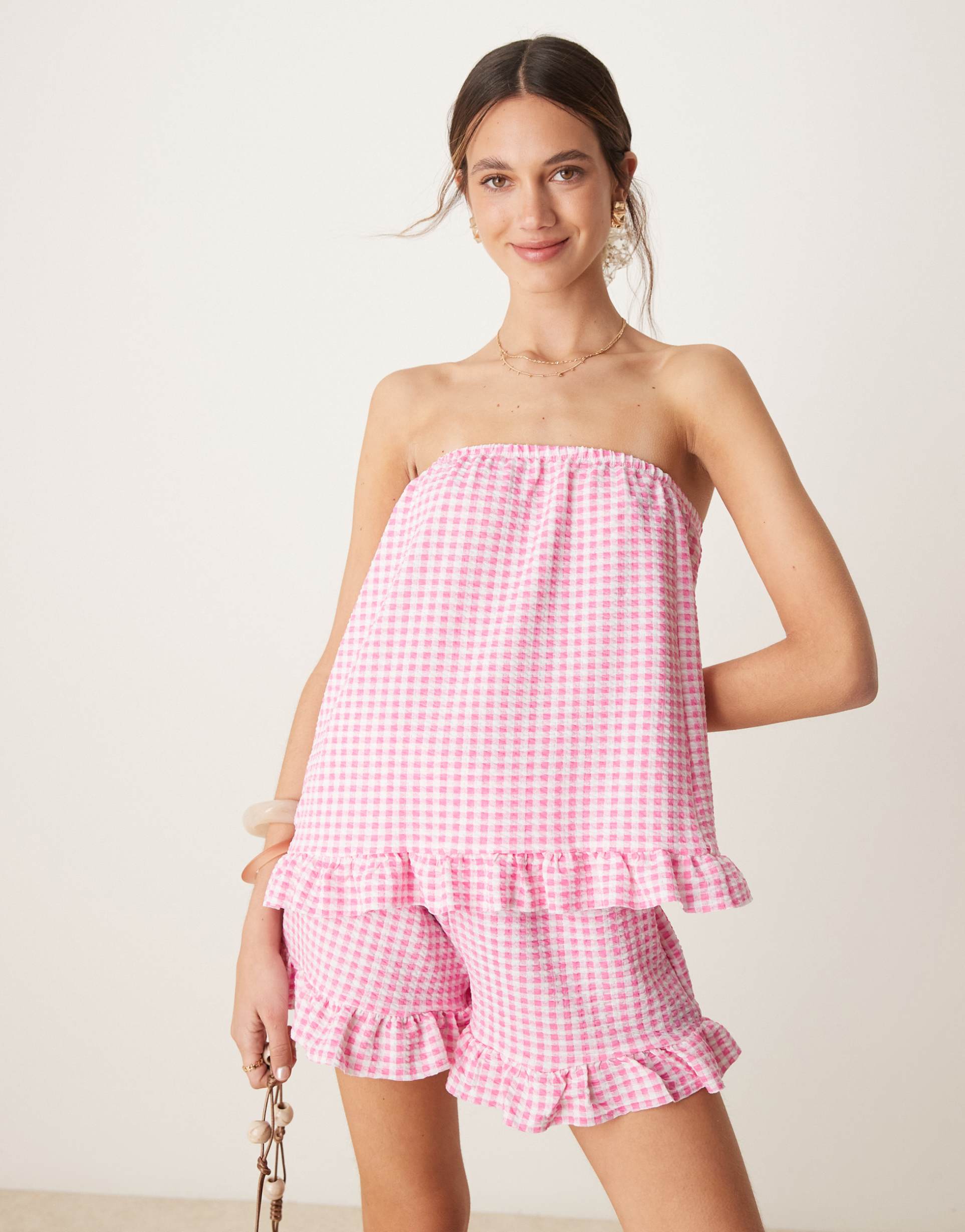 ASOS DESIGN BANDEAU TOP WITH FRILL HEM IN PINK GINGHAM - PART OF A SET