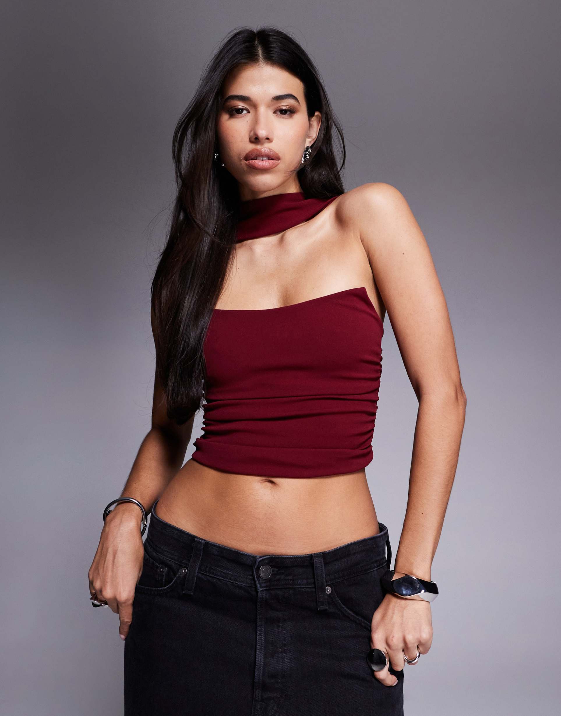 ASOS DESIGN BANDEAU TOP WITH SCARF NECK DETAIL IN BURGUNDY