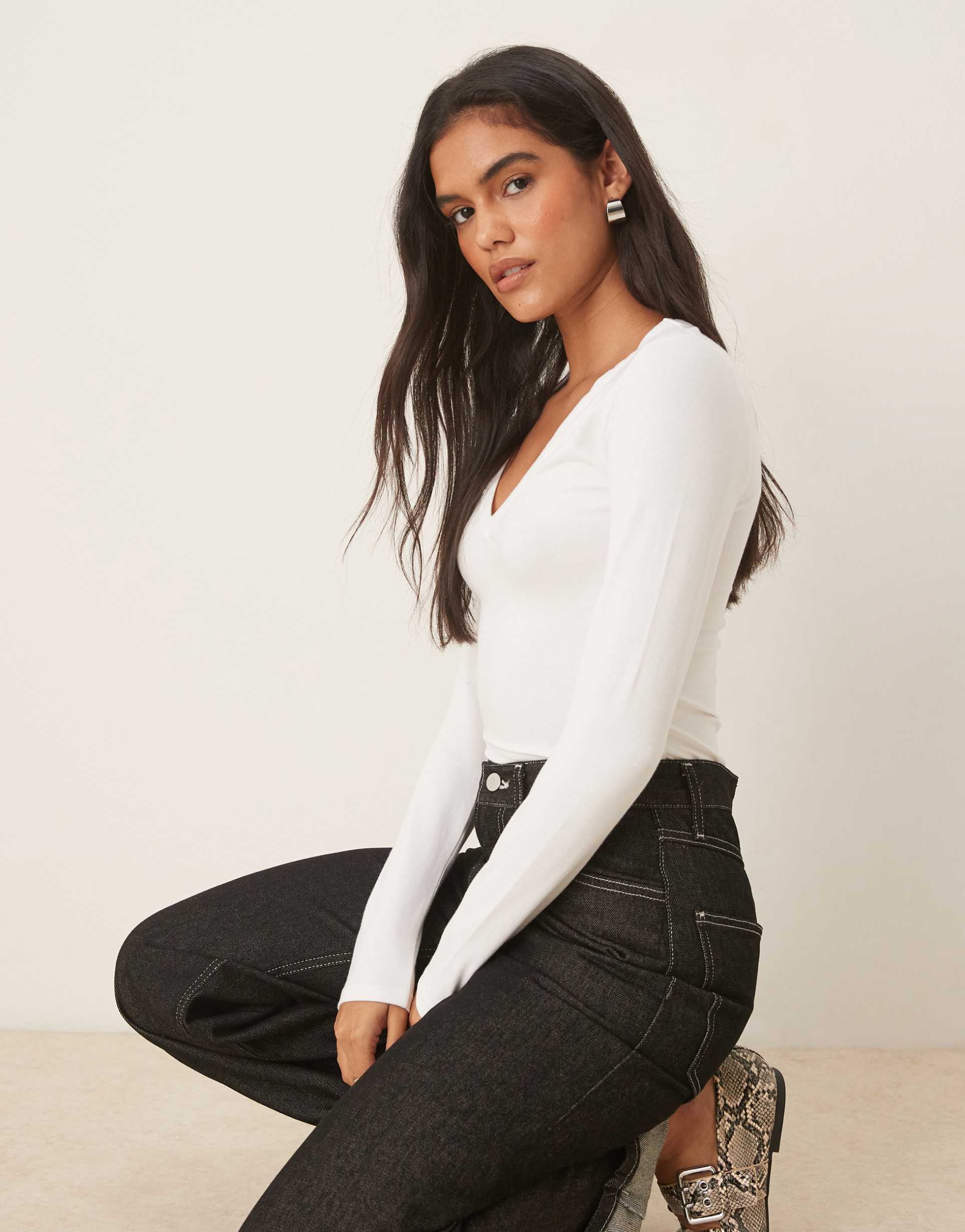 ASOS DESIGN BASIC LONG SLEEVE V NECK FITTED TOP IN WHITE