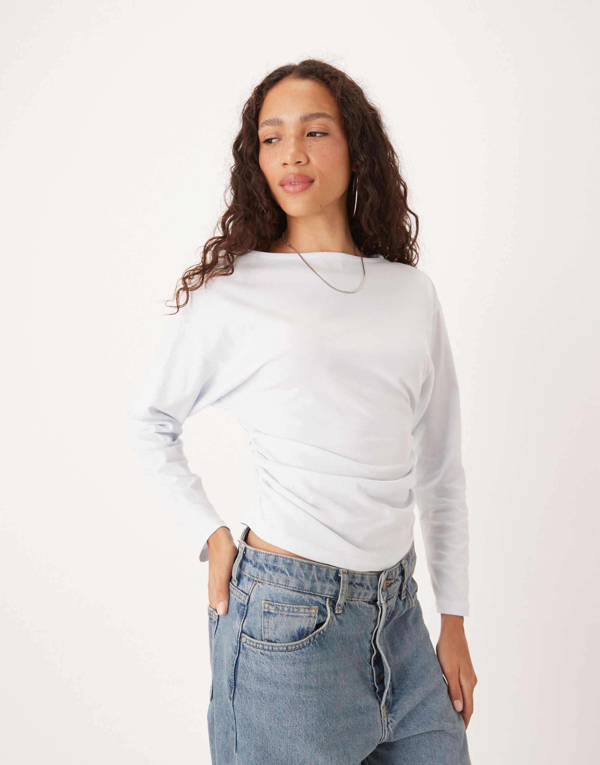 ASOS DESIGN BATWING CINCHED SLASH NECK DRAPED TOP IN BLUE
