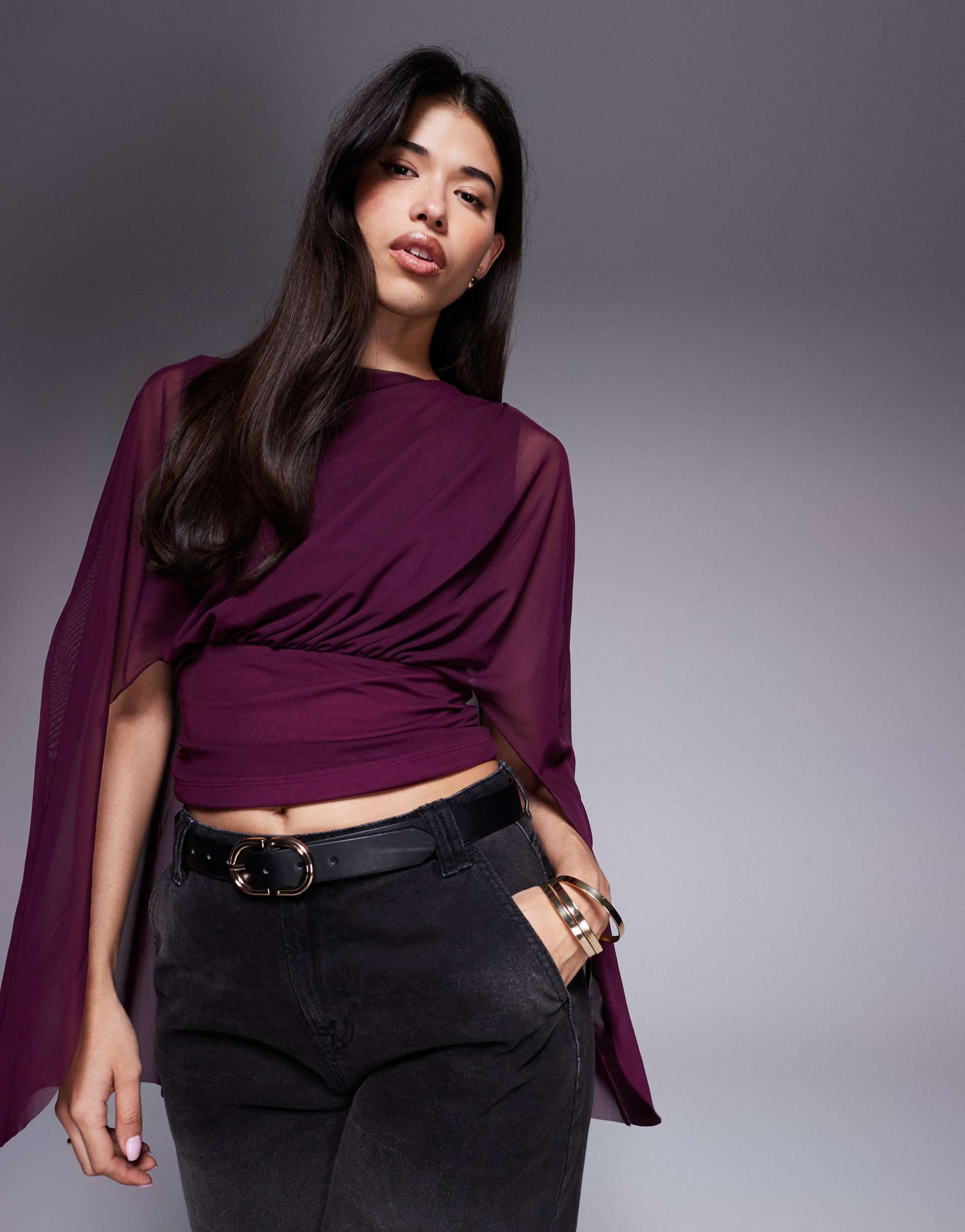 ASOS DESIGN BLOUSON MESH CAPE TOP IN PLUM