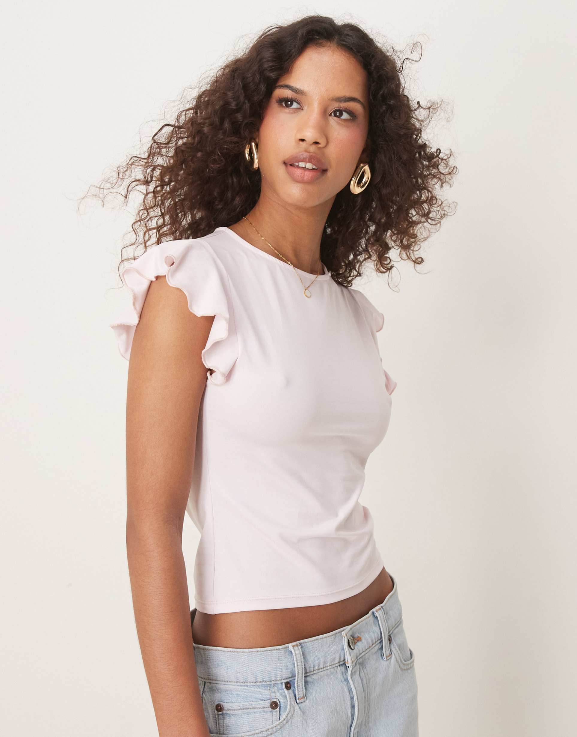 Soft and stretchy polyester-elastane blend fabric shapes this light pink shell top with a classic boat neck and charming ruffled cap sleeves. The regular fit and waist length silhouette create a flattering yet comfortable profile, perfect for casual days, brunch outings, or everyday wear. Its minimalist design combined with ruffle detailing adds a delicate feminine touch, making it an effortless piece for spring and summer wardrobes.
