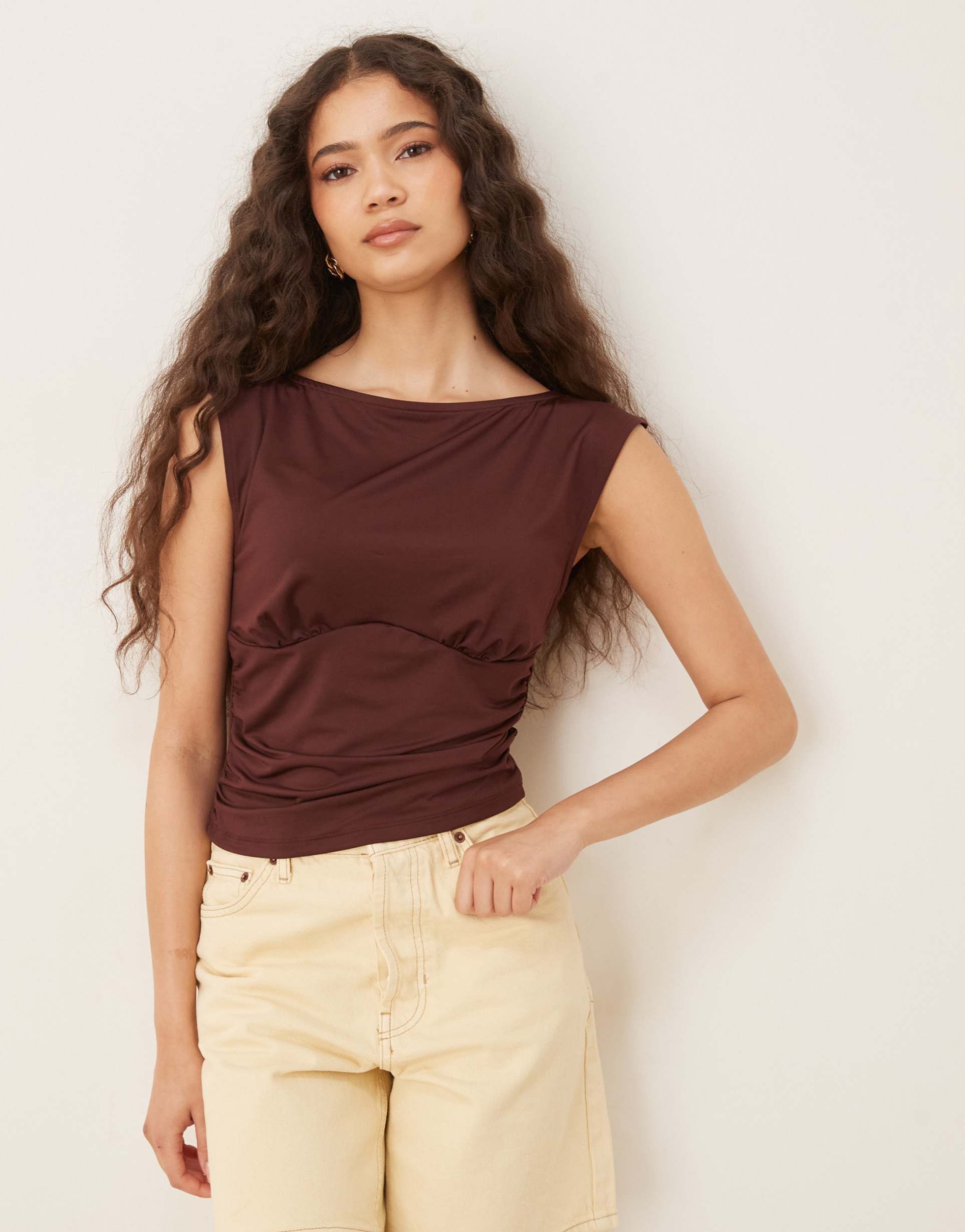 Soft polyester jersey and a flattering boat neck come together in this sleeveless shell top with subtle underbust ruching detail. Its regular fit and waist length make it an easy choice for casual days, workwear, or business casual settings. The rich matte brown hue adds a classic touch, while the pullover style ensures effortless wearability. A minimalist essential that pairs beautifully with tailored pants or jeans for versatile everyday styling.