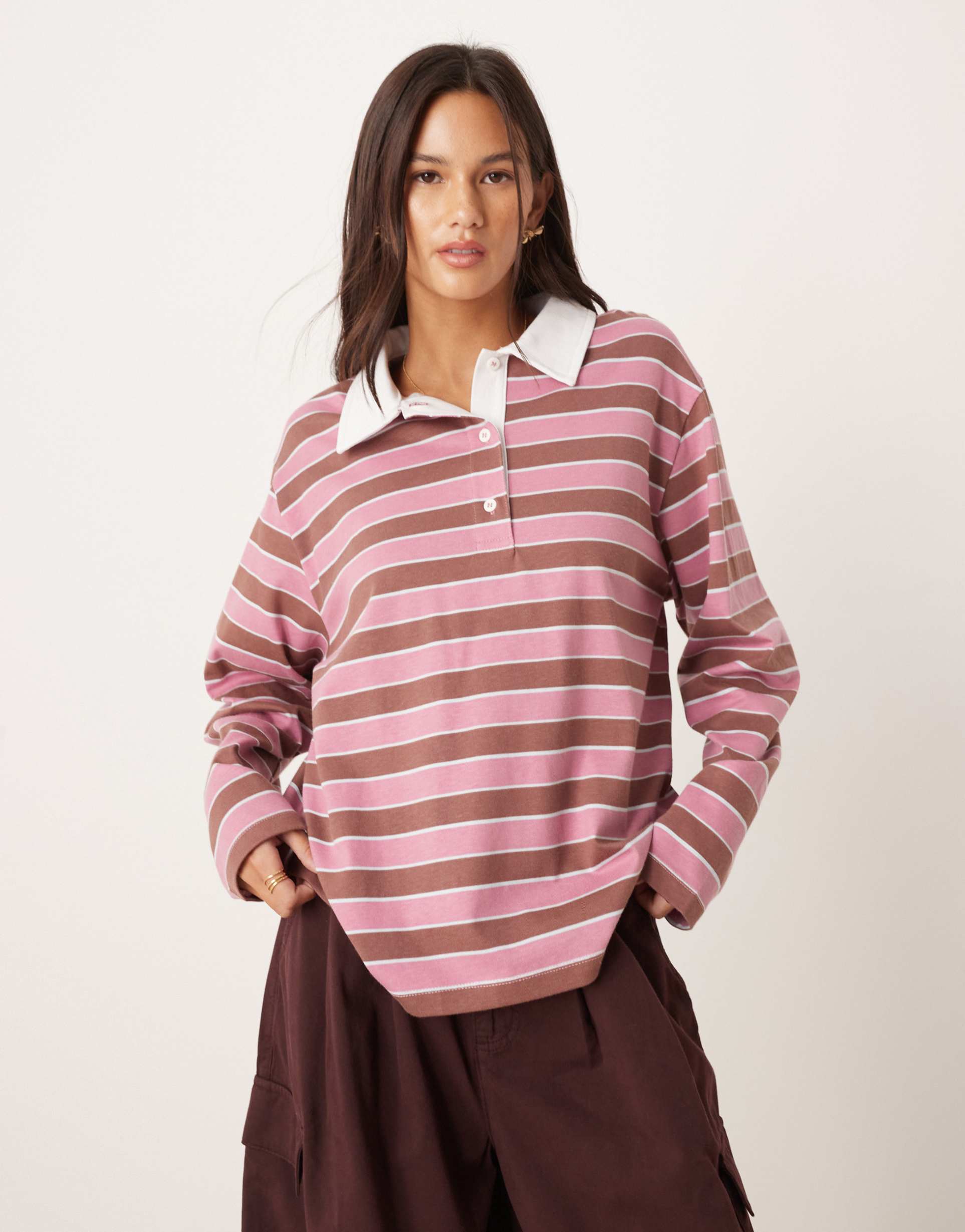 Soft jersey cotton and a boxy oversized fit make this striped rugby top a cozy yet stylish choice. Featuring a classic polo collar and a partial button placket, the long sleeves and hip-length hem offer comfortable coverage for cooler seasons. The dusty pink and white stripes lend a casual chic vibe perfect for everyday wear, casual outings, or street style looks. This versatile top pairs well with relaxed trousers or jeans for effortless layering during spring, autumn, or winter days.
