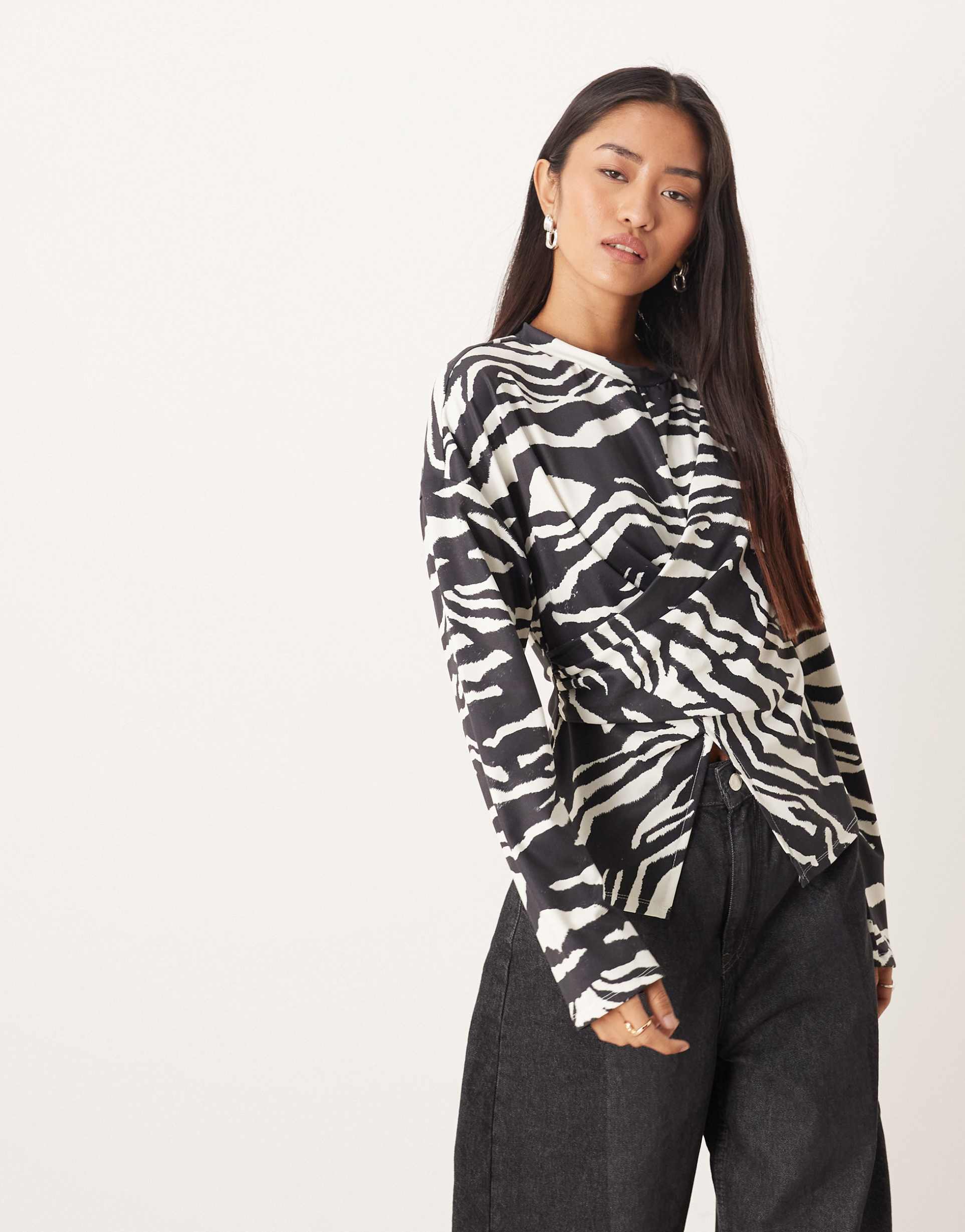 ASOS DESIGN CINCH WRAP WAIST LONG SLEEVE TOP IN ZEBRA PRINT