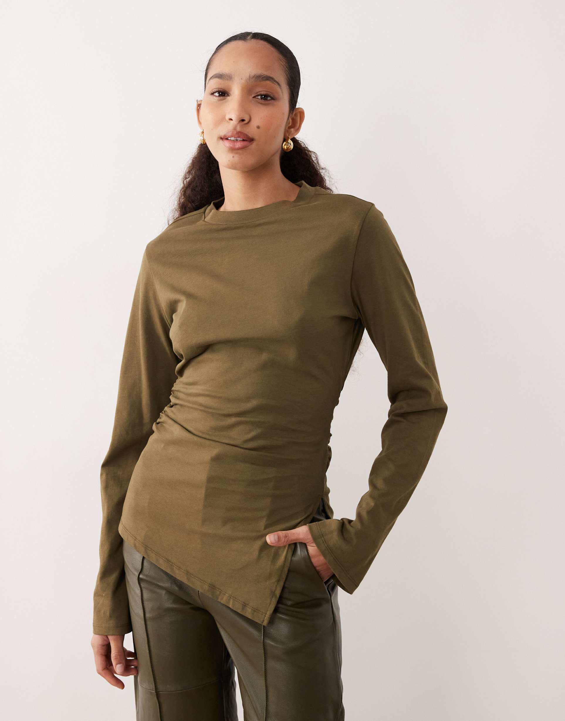 ASOS DESIGN CINCHED SIDE ASYMMETRIC LONG SLEEVE TOP IN OLIVE