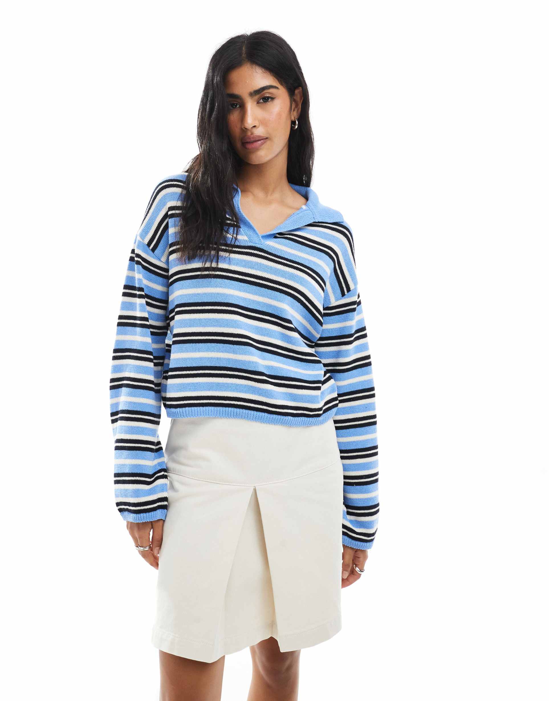 ASOS DESIGN COMPACT KNIT LONG SLEEVE POLO TOP IN BLUE STRIPES