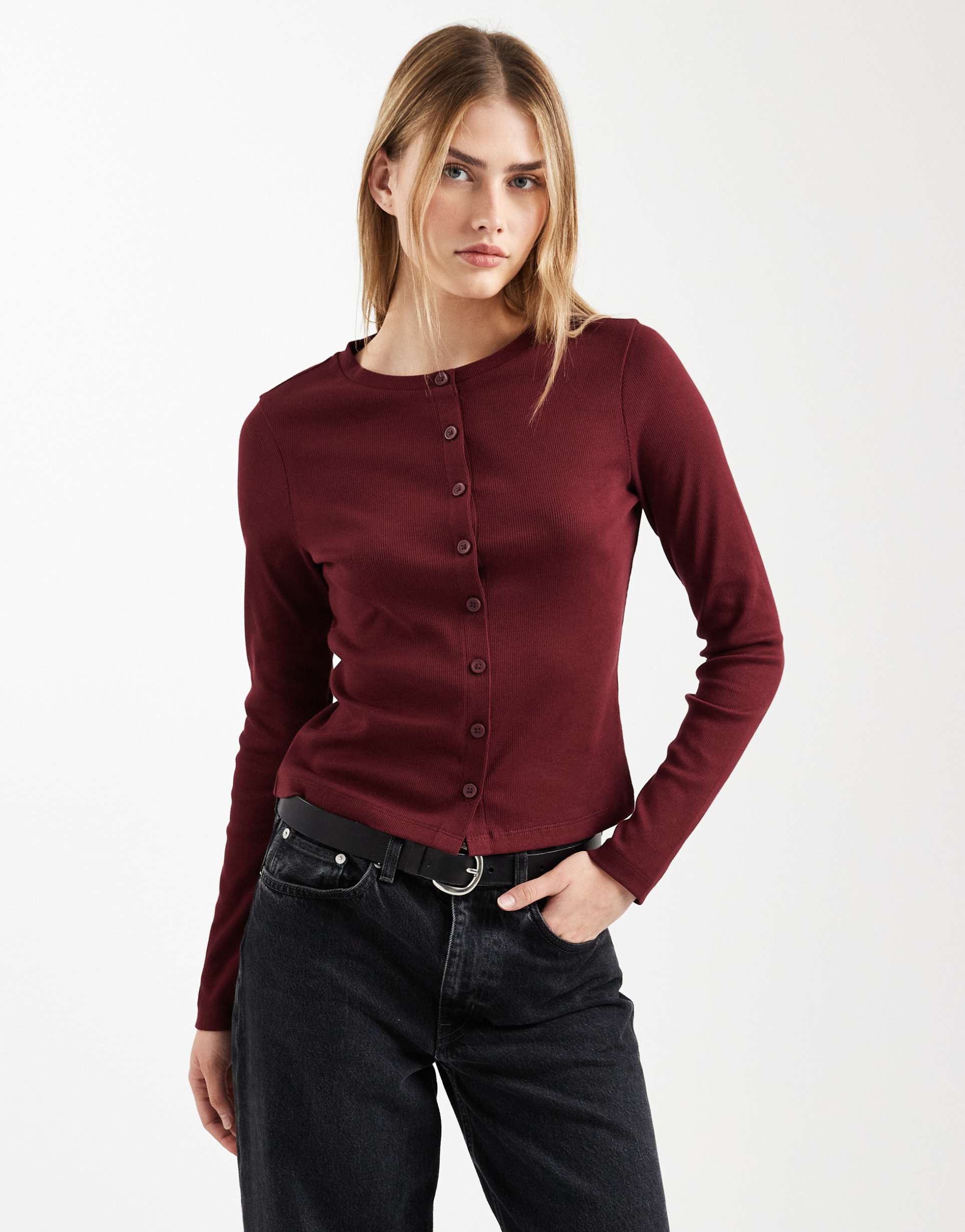 ASOS DESIGN COTTON RIB KNIT CREW NECK BUTTON UP TOP IN BURGUNDY
