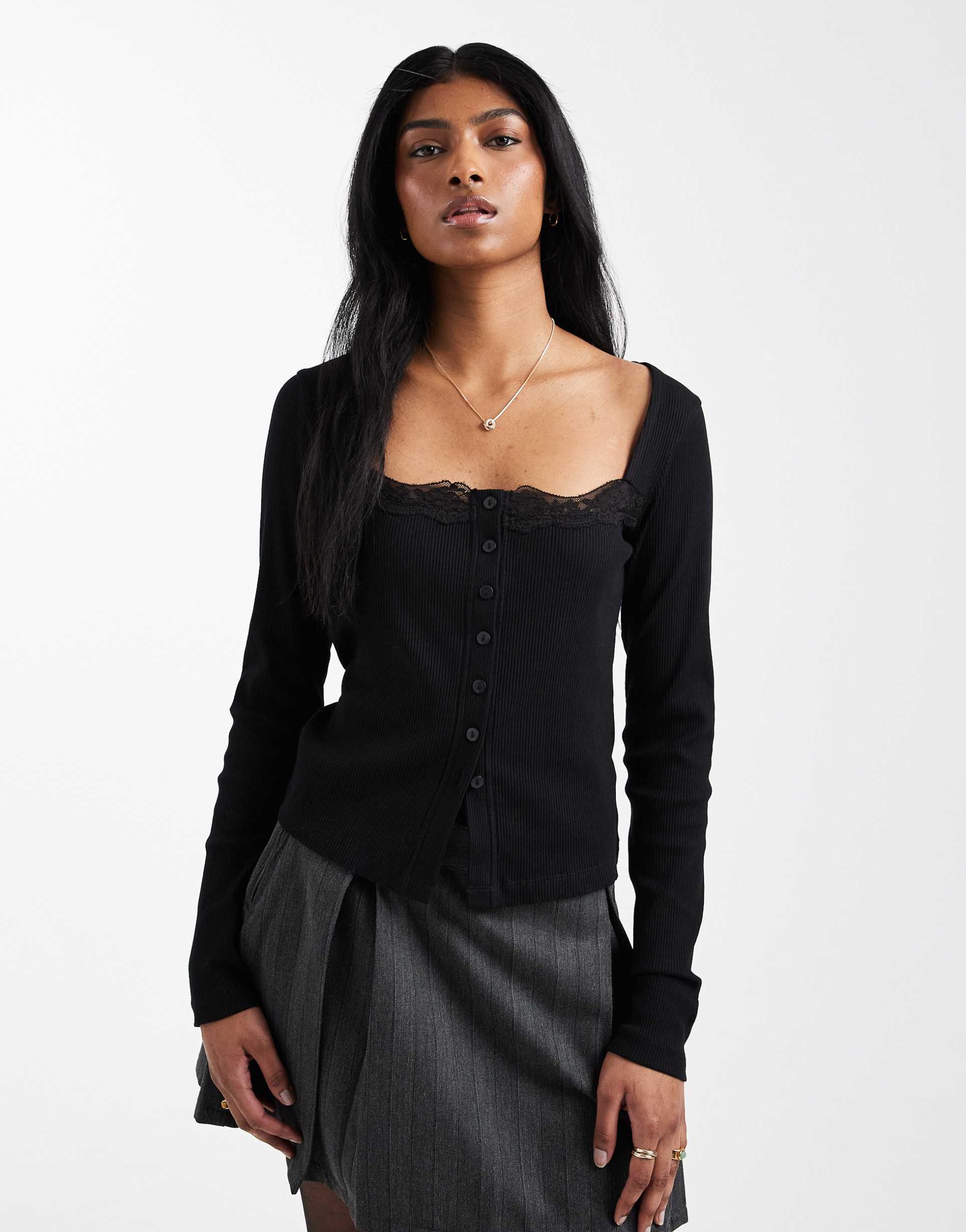 ASOS DESIGN COTTON RIBBED BUTTON DOWN SQUARE NECK TOP WITH LACE TRIM IN BLACK