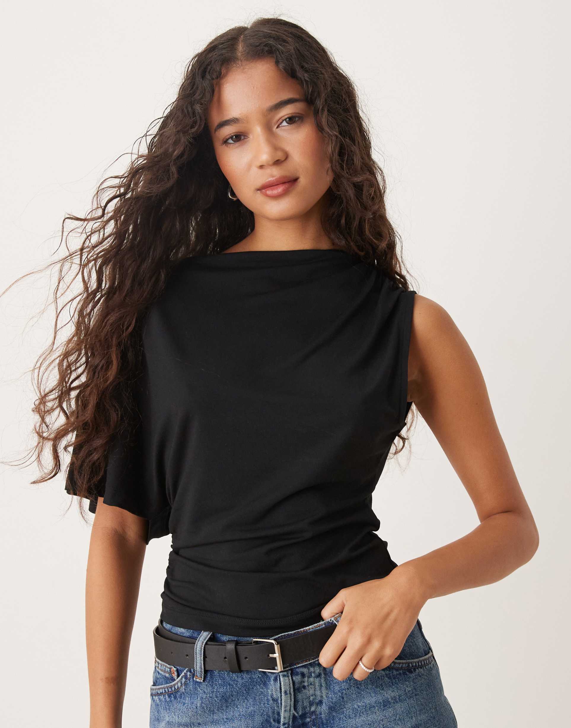 ASOS DESIGN CUPRO ONE SHOULDER CAPE TOP IN CHARCOAL
