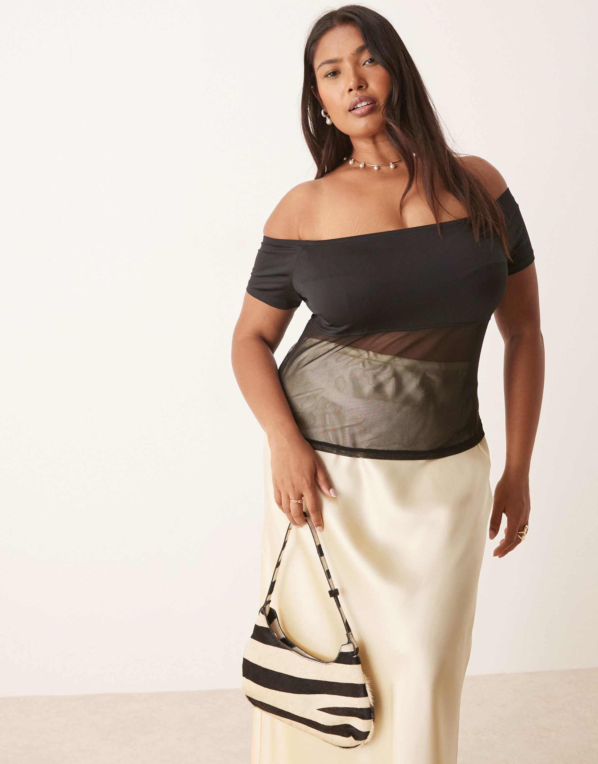 ASOS DESIGN CURVE BARDOT MESH MIX PANEL TOP IN BLACK