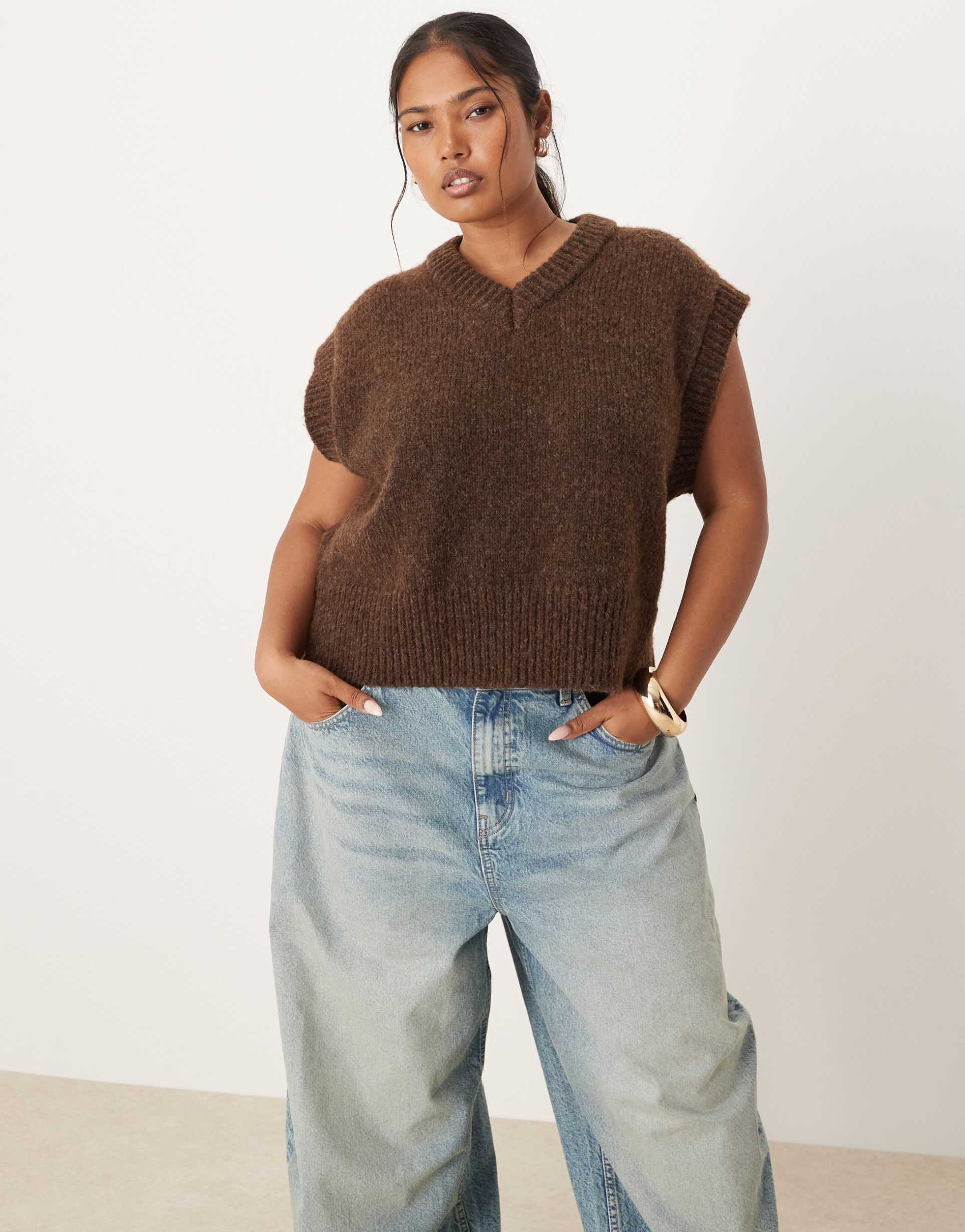 ASOS DESIGN CURVE BOXY FLUFFY V NECK TANK TOP IN MOCHA