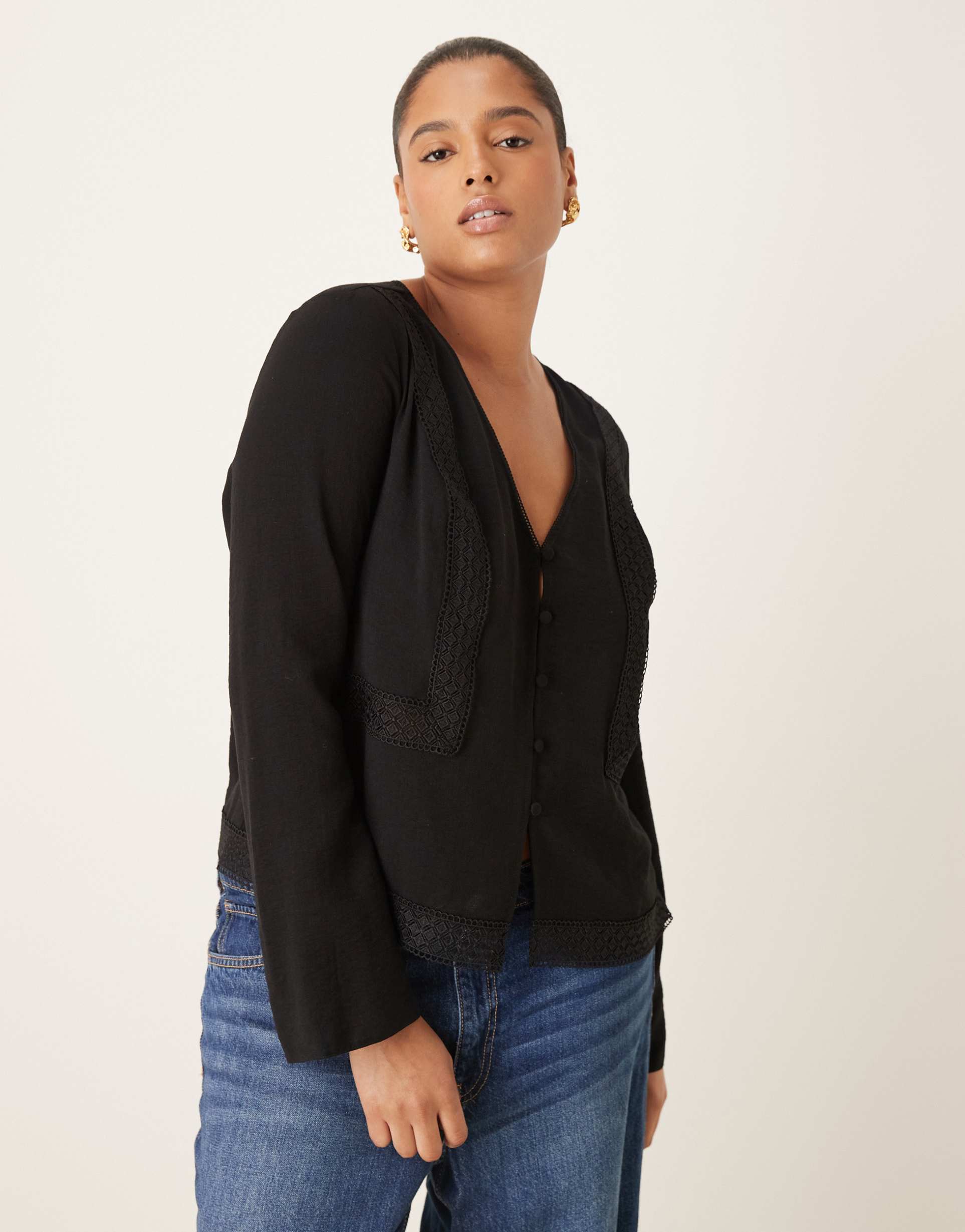 ASOS DESIGN CURVE LACE TRIM LONG SLEEVE TOP IN BLACK