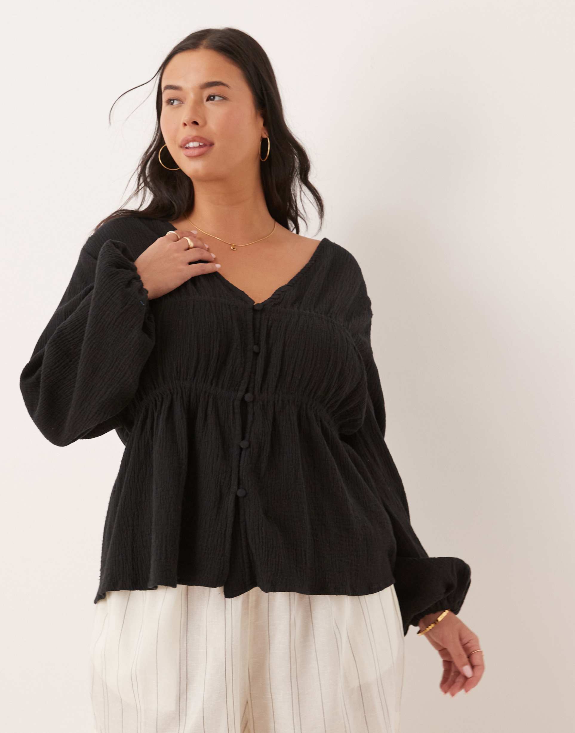 ASOS DESIGN CURVE LONG SLEEVE SMOCK TOP WITH BUTTON FRONT IN BLACK