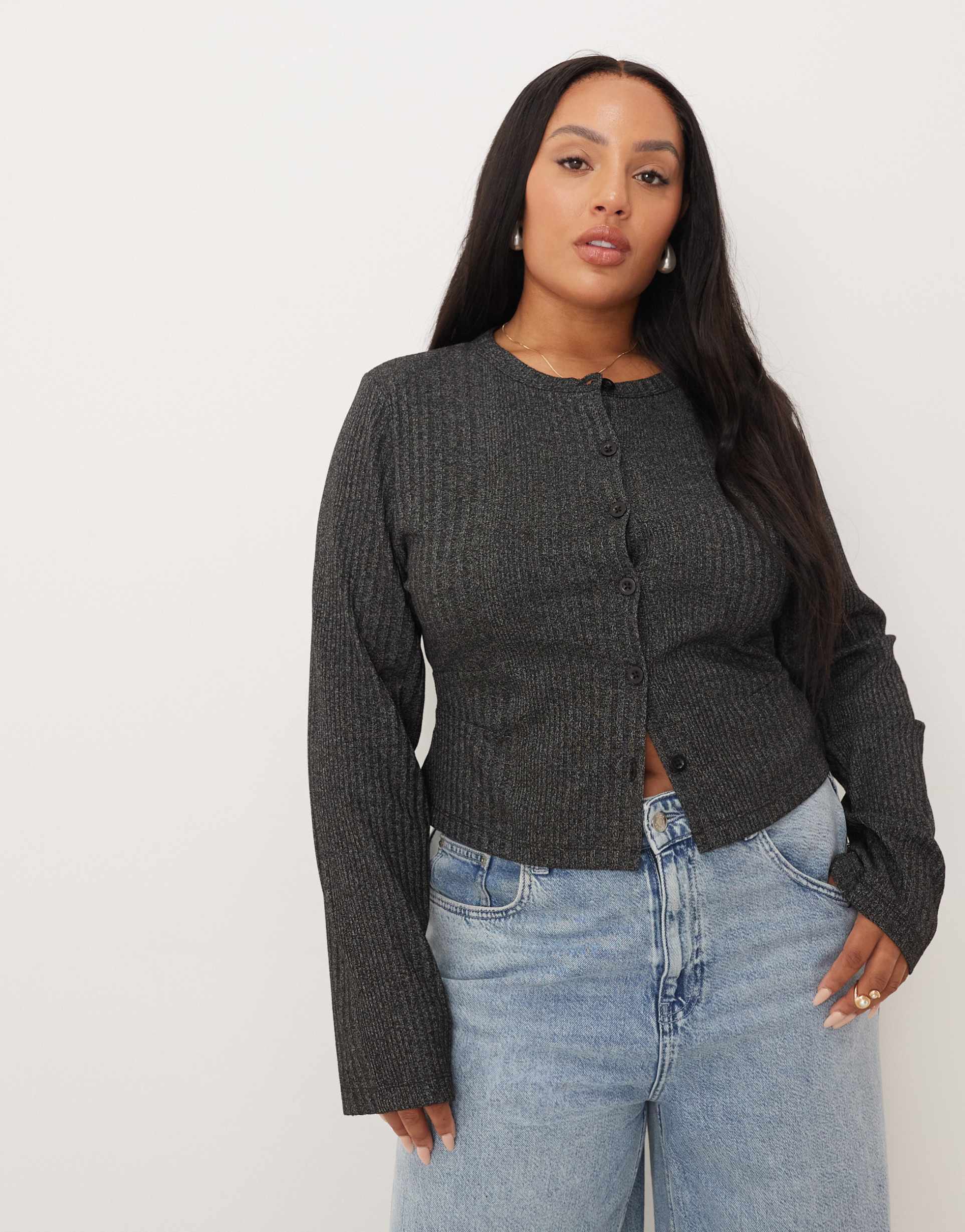 ASOS DESIGN CURVE RIBBED DETAILING LONG SLEEVE BUTTON UP TOP IN HEATHERED CHARCOAL