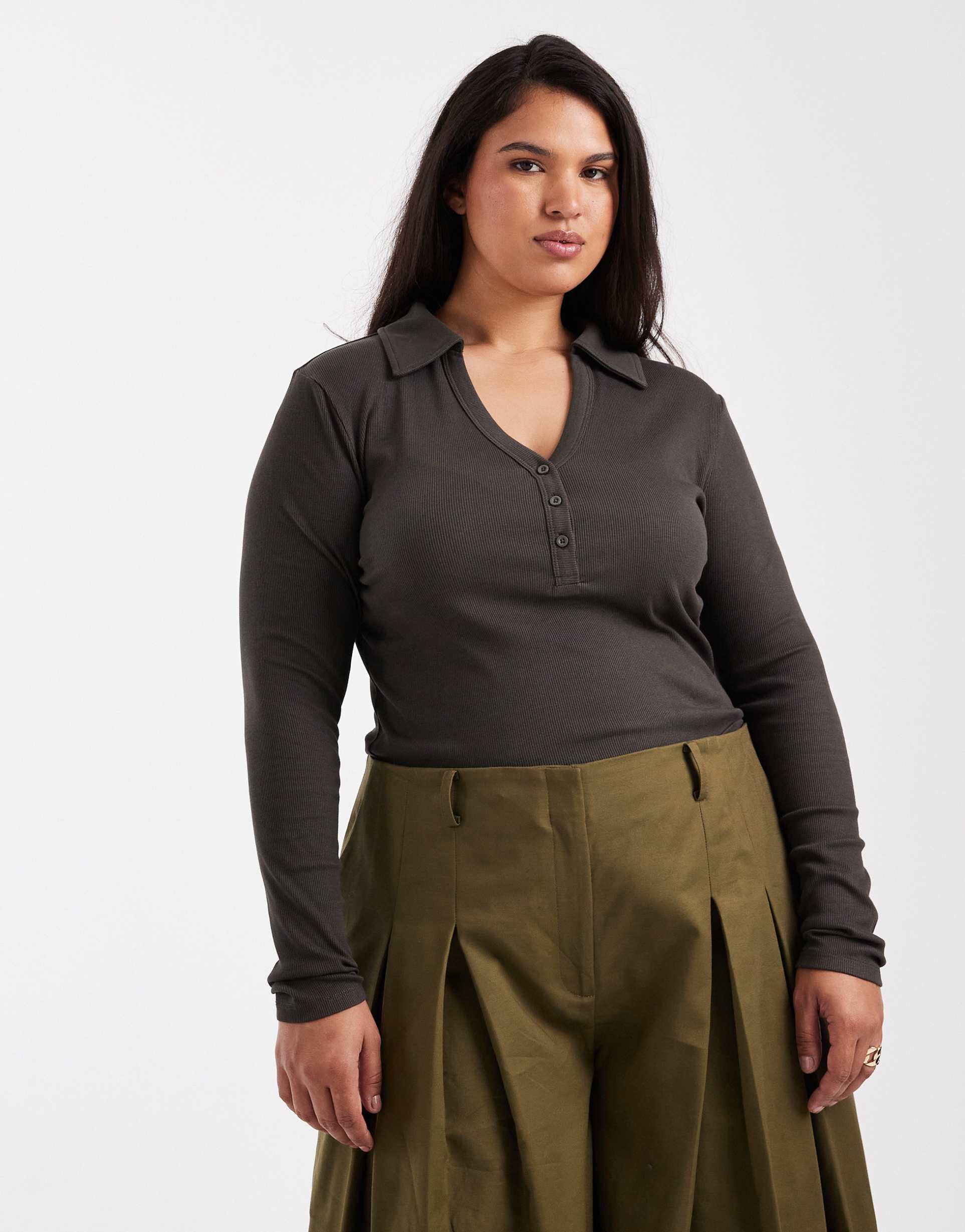 ASOS DESIGN CURVE SHRUNKEN RIBBED HENLEY LONG SLEEVE TOP WITH COLLAR IN CHARCOAL