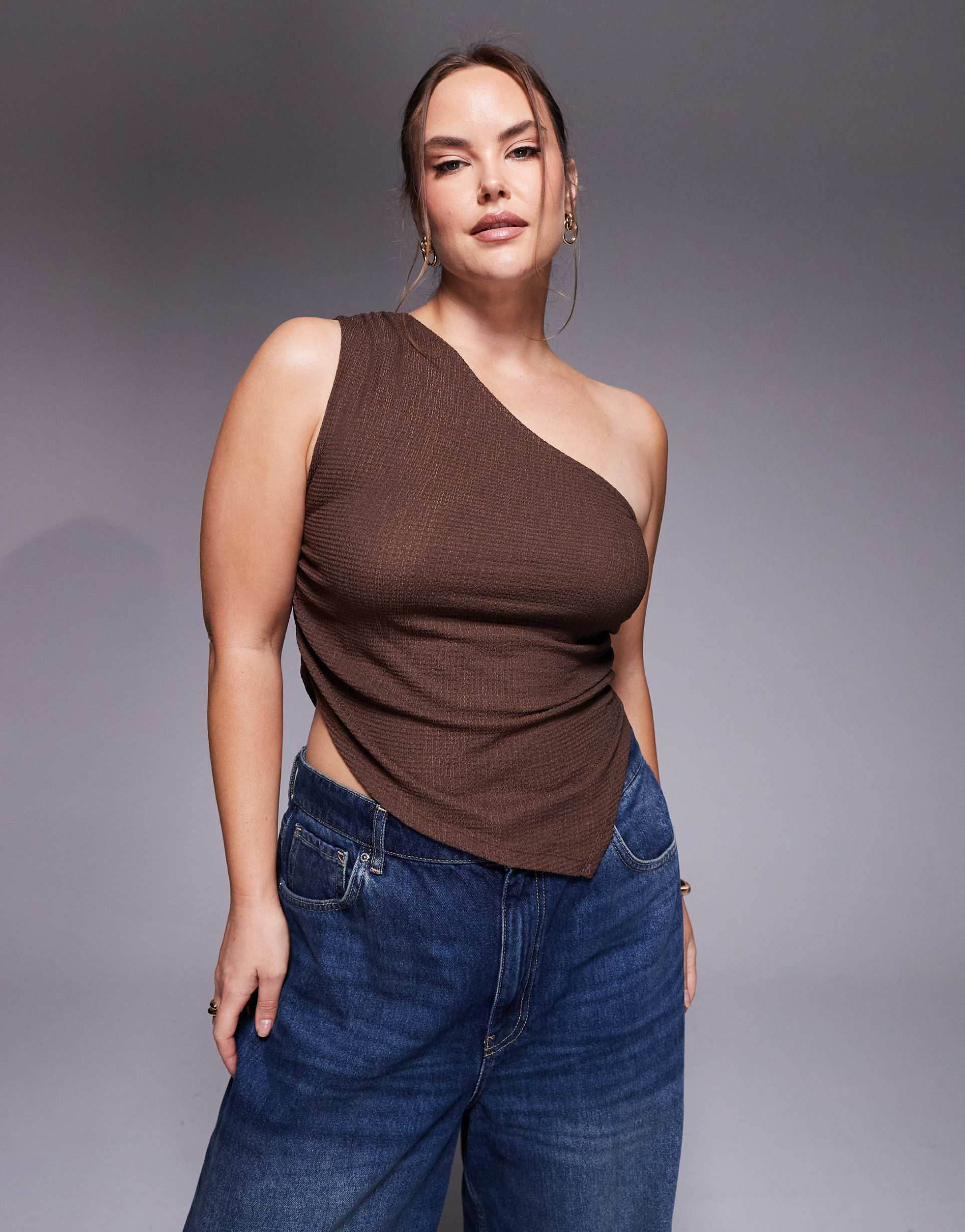 ASOS DESIGN CURVE TEXTURED ONE SHOULDER RUCHED TOP IN CHOCOLATE