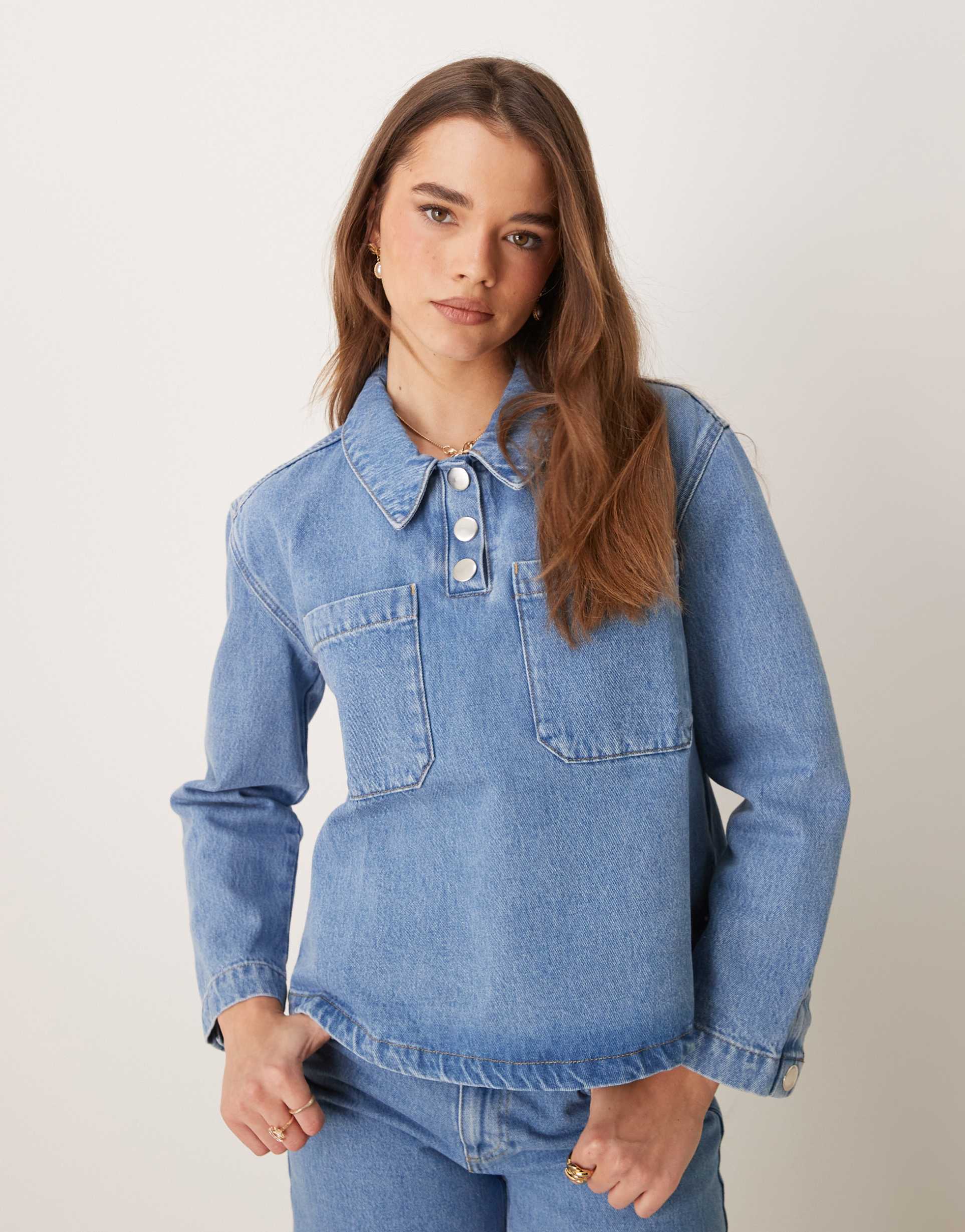 Top by ASOS DESIGNLife hack: wear denimSpread collarPartial snap placketChest pocketsCropped lengthRegular fitProduct Code: 140292323Non-stretch denim: mid-blue wash Main: 100% Cotton.