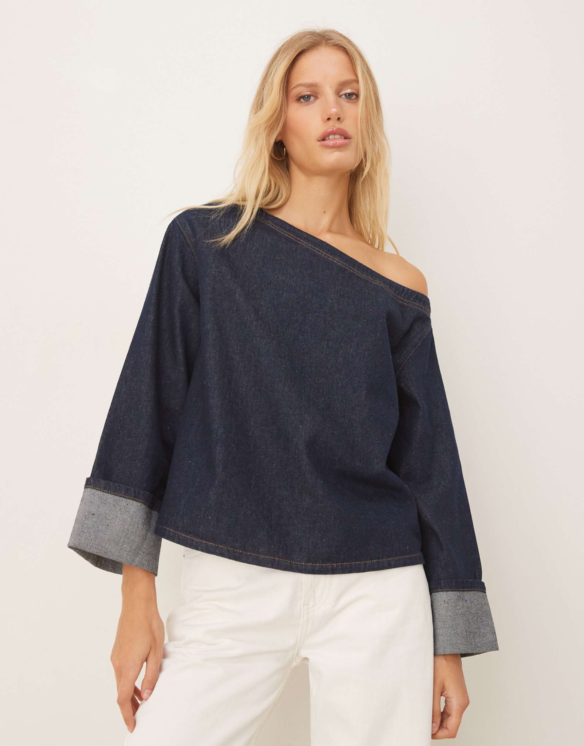 A timeless matte dark blue denim off-shoulder top featuring a relaxed swing silhouette and long sleeves with distinctive turn-back cuffs adding a subtle ruffle detail. Crafted from 100% cotton denim, this hip-length piece boasts a regular fit that balances comfort and style effortlessly. The off-shoulder neckline lends a casual chic vibe, perfect for spring and summer days. Ideal for casual outings, everyday wear, or brunch gatherings, it combines minimalist design with laid-back sophistication, making it a versatile staple in any wardrobe.