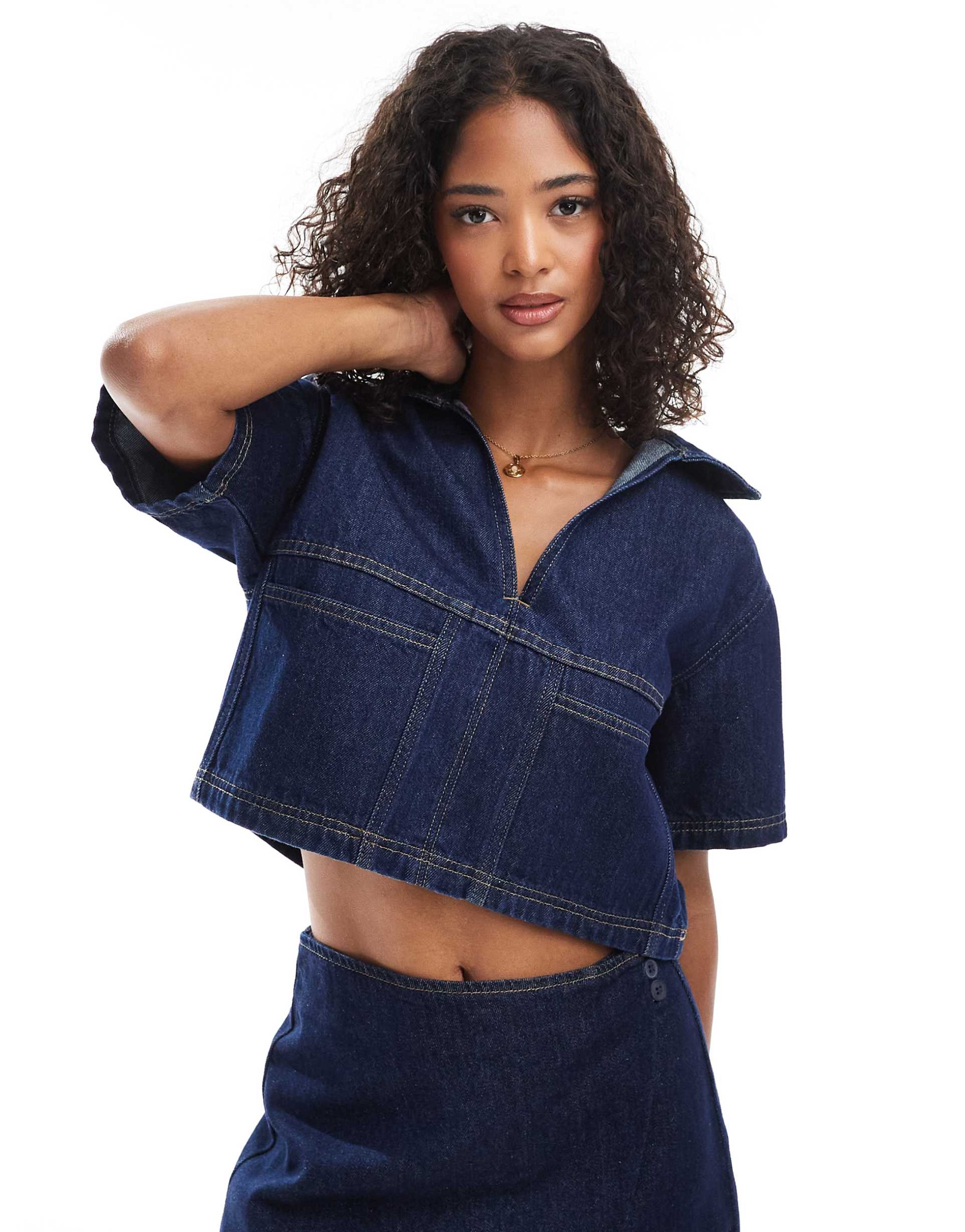 Classic matte blue denim crafted from 100% cotton defines this cropped rugby top with a spread collar and V-neck for a relaxed yet polished look. The regular fit and half sleeves ensure comfort and easy movement, while the button closure adds a subtle detail. Perfect for casual outings, everyday wear, or street style occasions, this versatile piece pairs effortlessly with high-waisted bottoms. Its cropped length and minimalist design make it a stylish staple for spring through autumn wardrobes.
