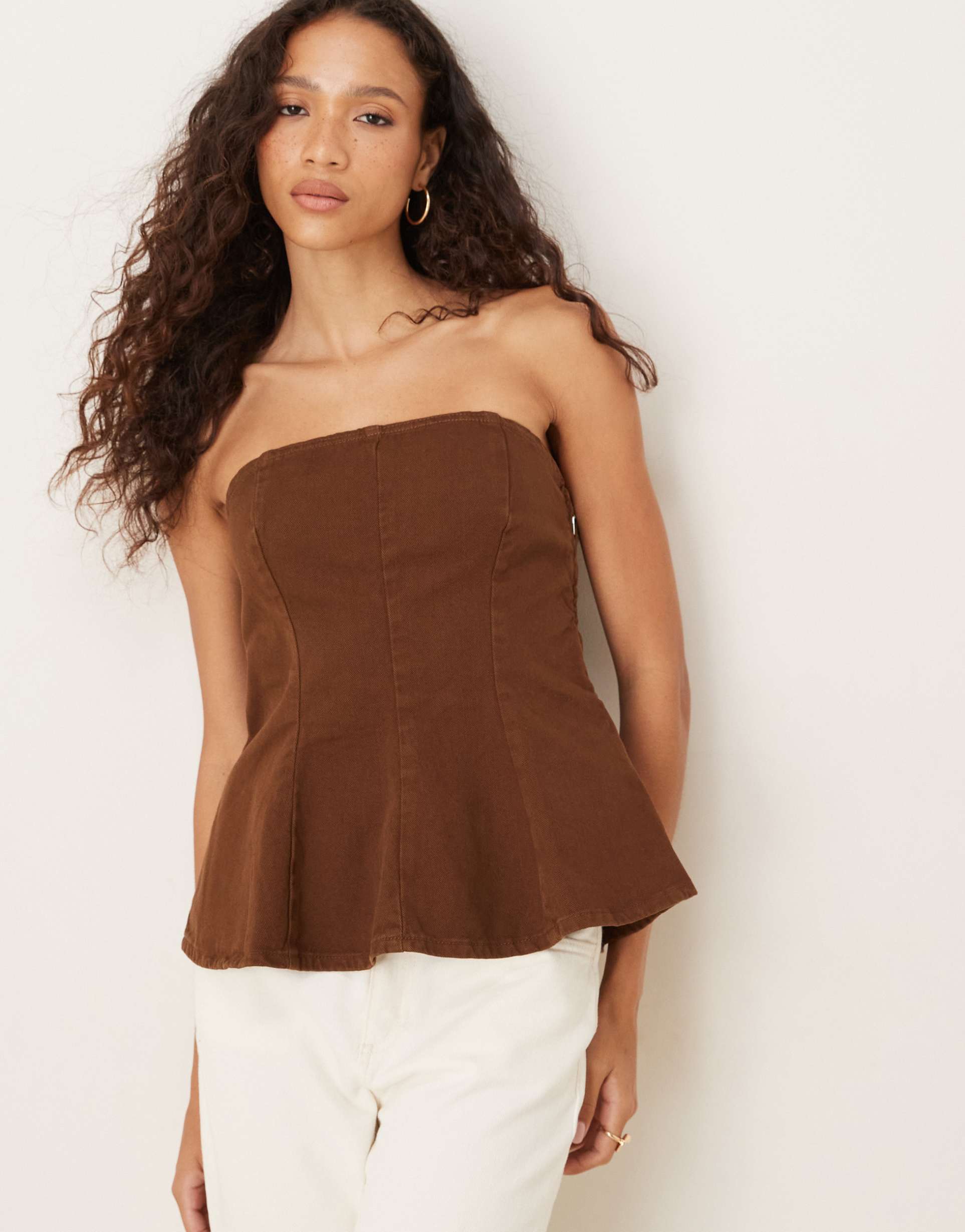 ASOS DESIGN DENIM STRUCTURED PEPLUM BANDEAU TOP IN CHOCOLATE