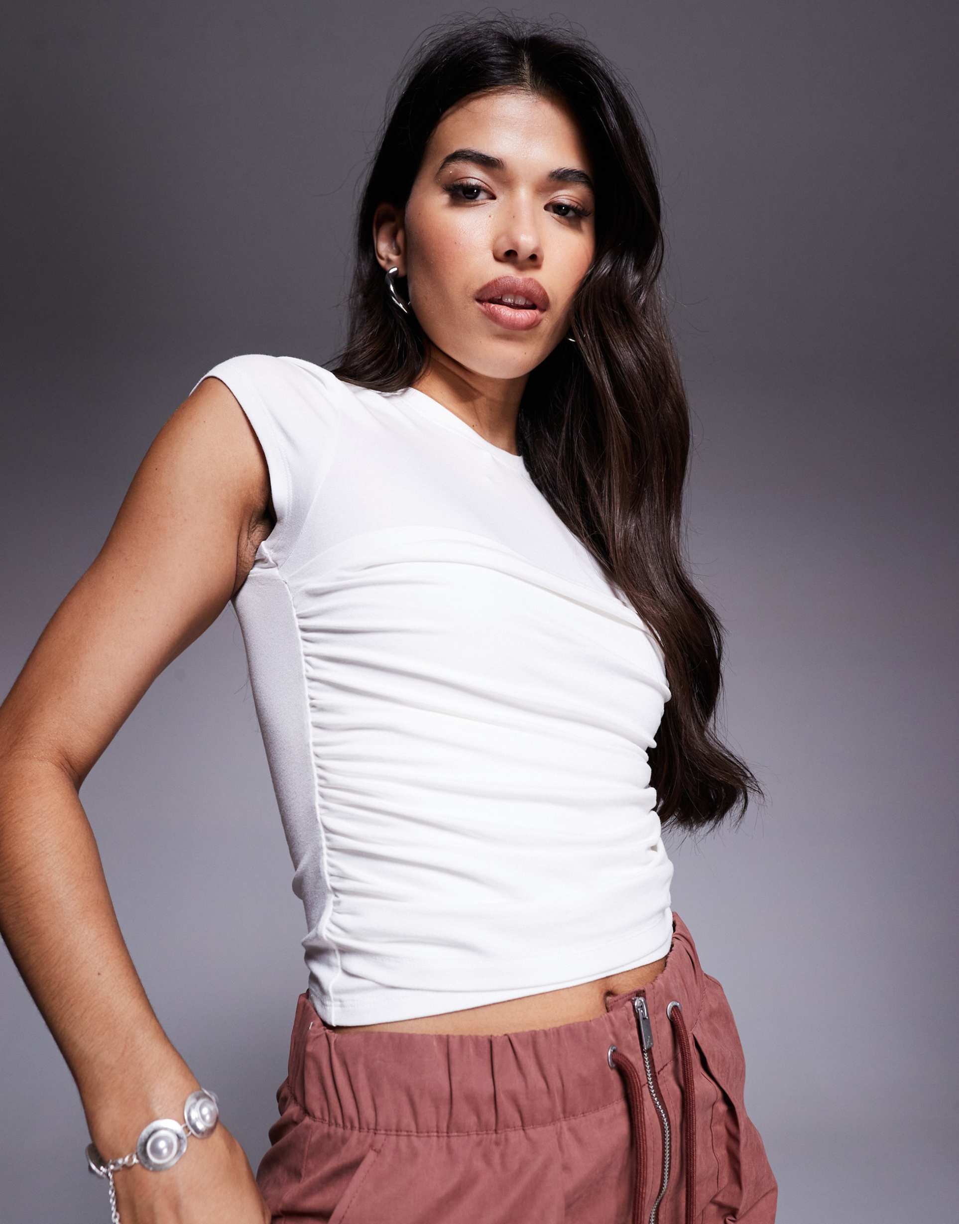 Soft and stretchy polyester fabric forms this slim fit shell top featuring a classic crew neck and sleeveless styling with strap-like shoulders. The waist-length silhouette is enhanced by elegant ruching along the sides, adding texture and flattering detail. Ideal for spring and summer, this minimalist ivory top pairs effortlessly with casual and chic outfits, making it perfect for everyday wear, brunch dates, or relaxed weekend outings.
