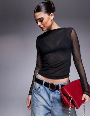 ASOS DESIGN FITTED HIGH NECK DOUBLE LAYER MESH LONG SLEEVE TOP IN BLACK