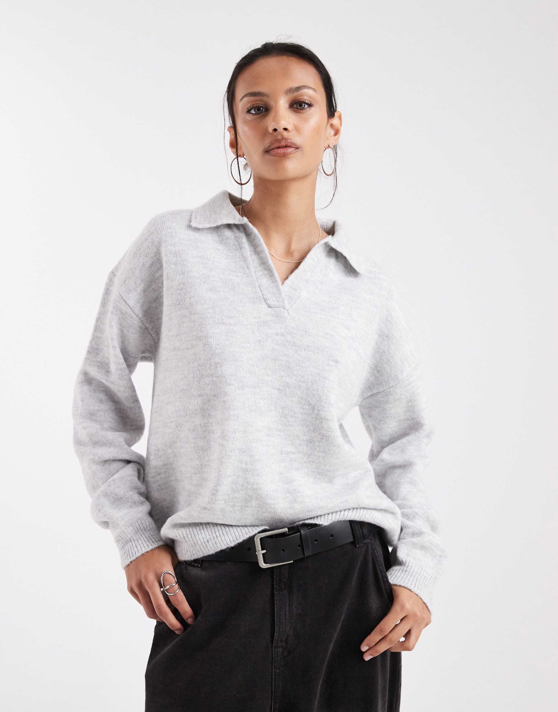 ASOS DESIGN FLUFFY KNIT POLO TOP IN HEATHER GRAY