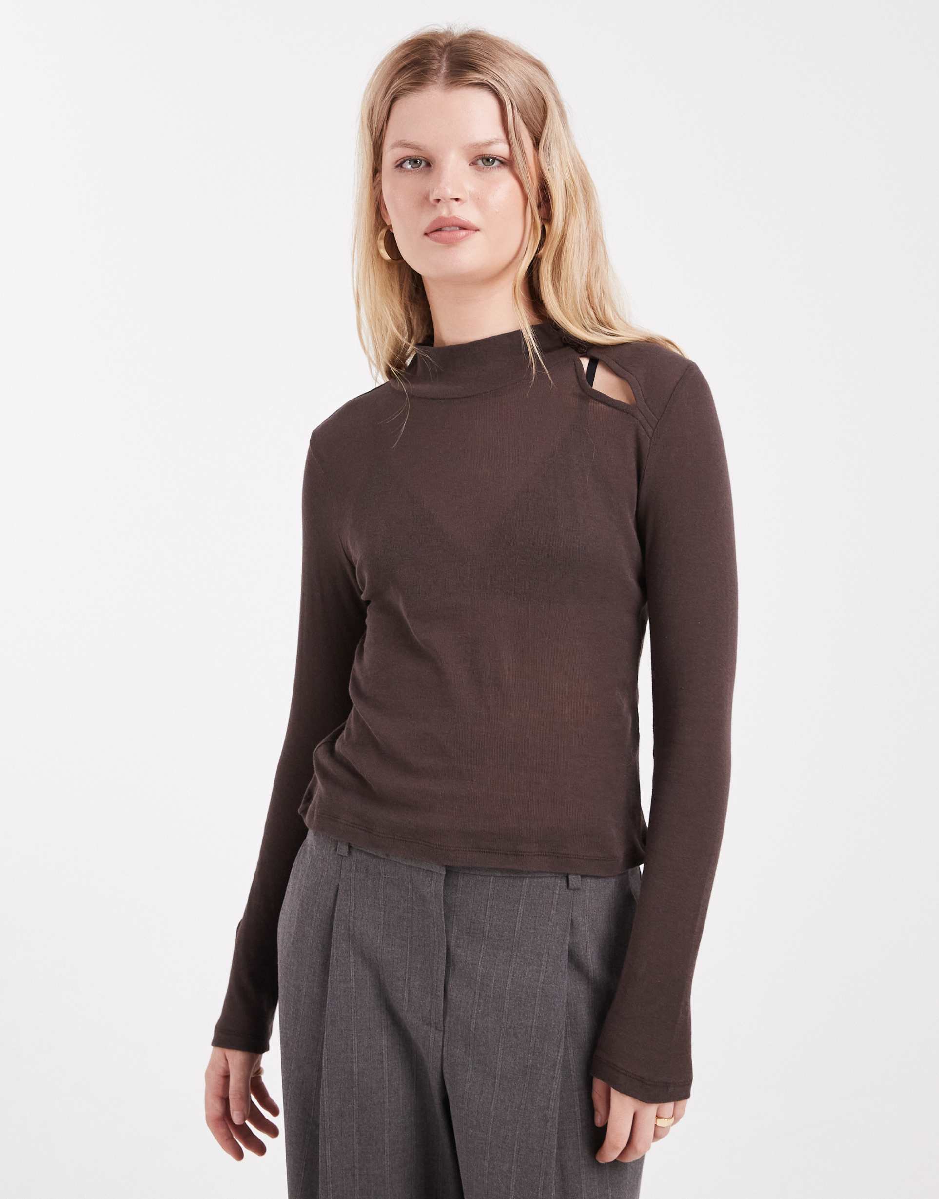 ASOS DESIGN FUNNEL NECK BUTTON DETAIL LONG SLEEVE TOP IN CHOCOLATE BROWN