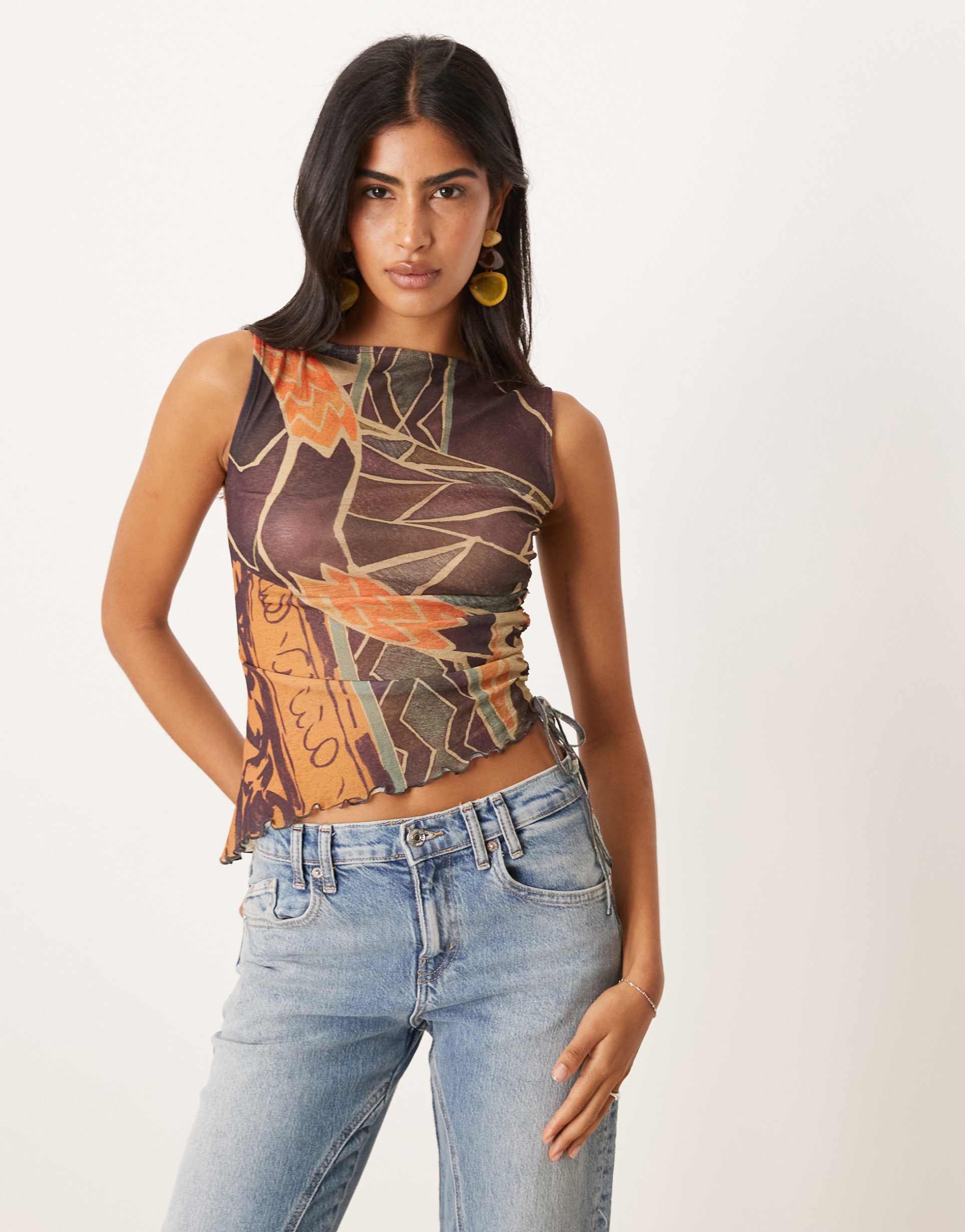 Fine mesh fabric and an all-over abstract batik print create a bohemian vibe in this slim fit tank top. Featuring a round neckline, sleeveless styling with strap-like shoulders, and ruched drawstring detail along the side, it boasts an asymmetrical hem that adds a trendy edge. The sheer, gauzy mesh texture combined with polyester and elastane blend offers lightweight comfort and slight stretch. Perfect for summer festivals, casual streetwear, or laid-back brunches, this versatile piece brings effortless style with a matte brown base and muted orange accents.
