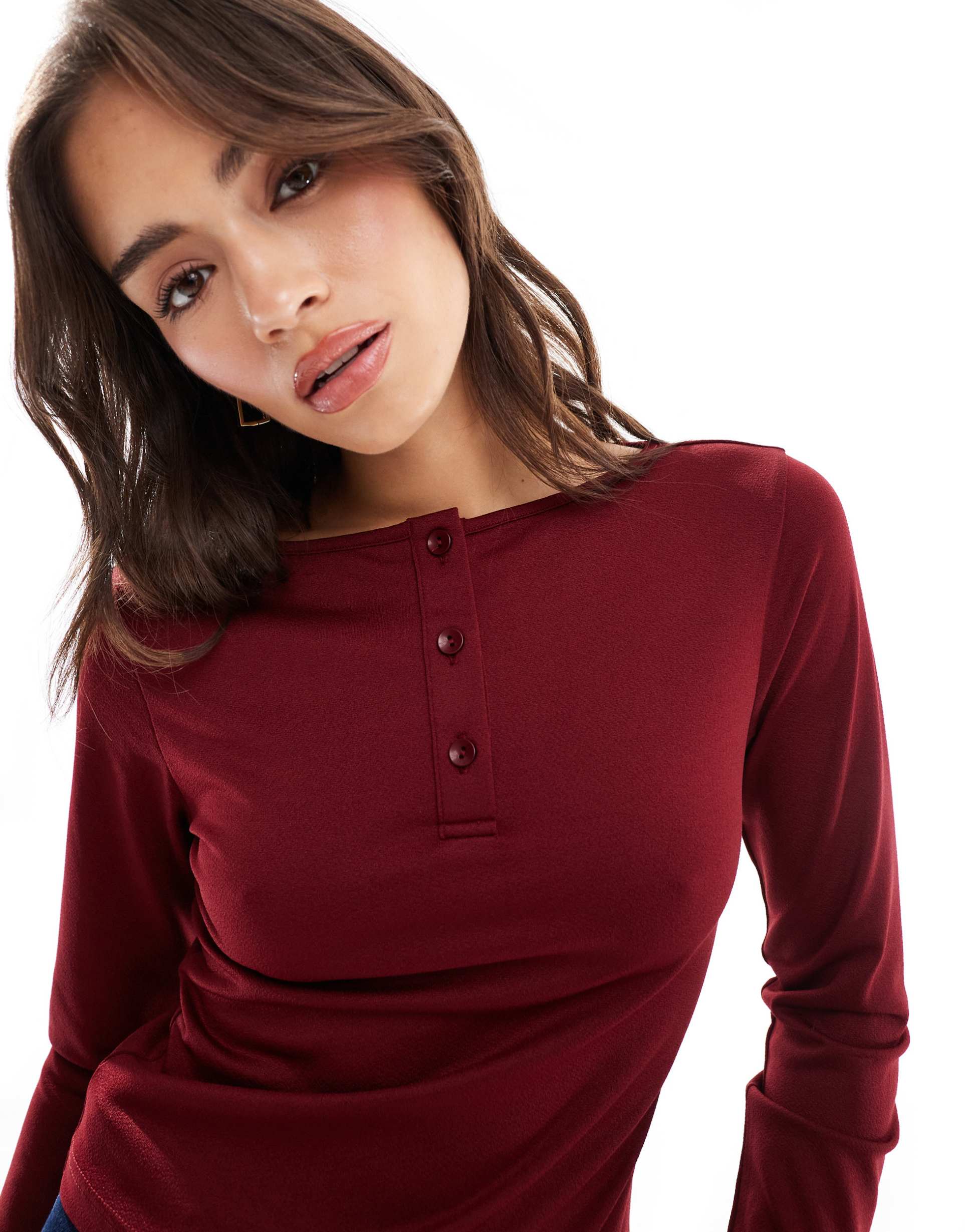 ASOS DESIGN GAUZY MESH HENLEY LONG SLEEVE TOP IN BURGUNDY