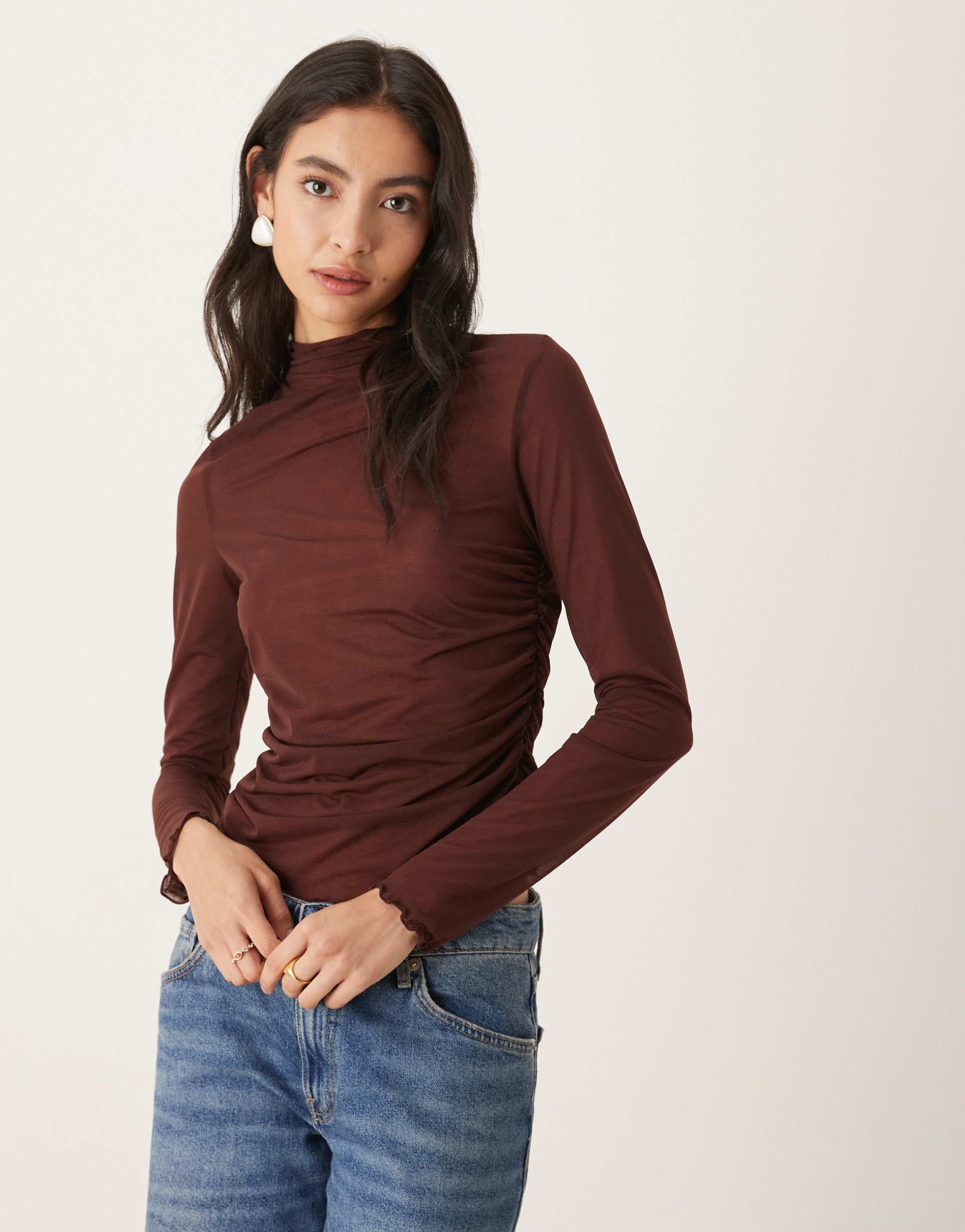 ASOS DESIGN HIGH NECK MESH SEMI SHEER LONG SLEEVE TOP IN CHOCOLATE