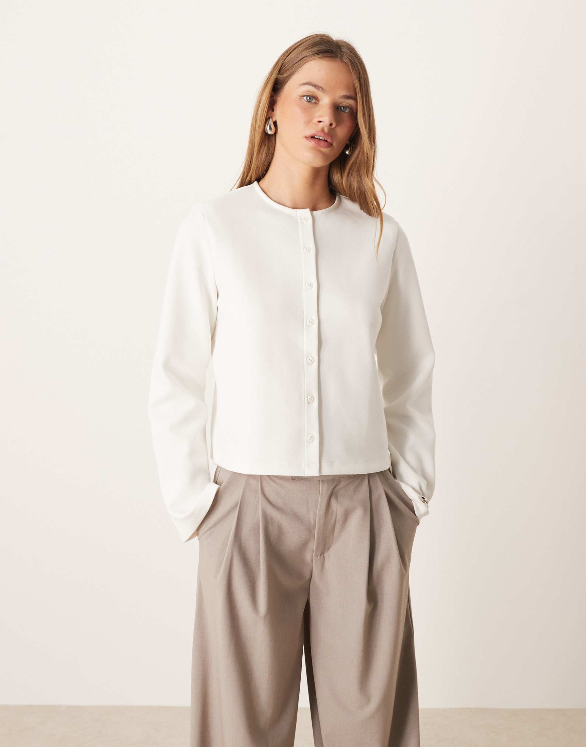 Crisp cotton fabric and a regular fit define this ASOS DESIGN boxy top in a clean ivory hue. Featuring a classic crew neck and long sleeves with structured shoulder pads, it offers a polished silhouette perfect for workwear, business casual, or casual outings. The front button placket enhances its minimalist style, while the hip-length cut ensures versatile layering options. This timeless piece blends comfort and sophistication, making it a wardrobe essential for all seasons.
