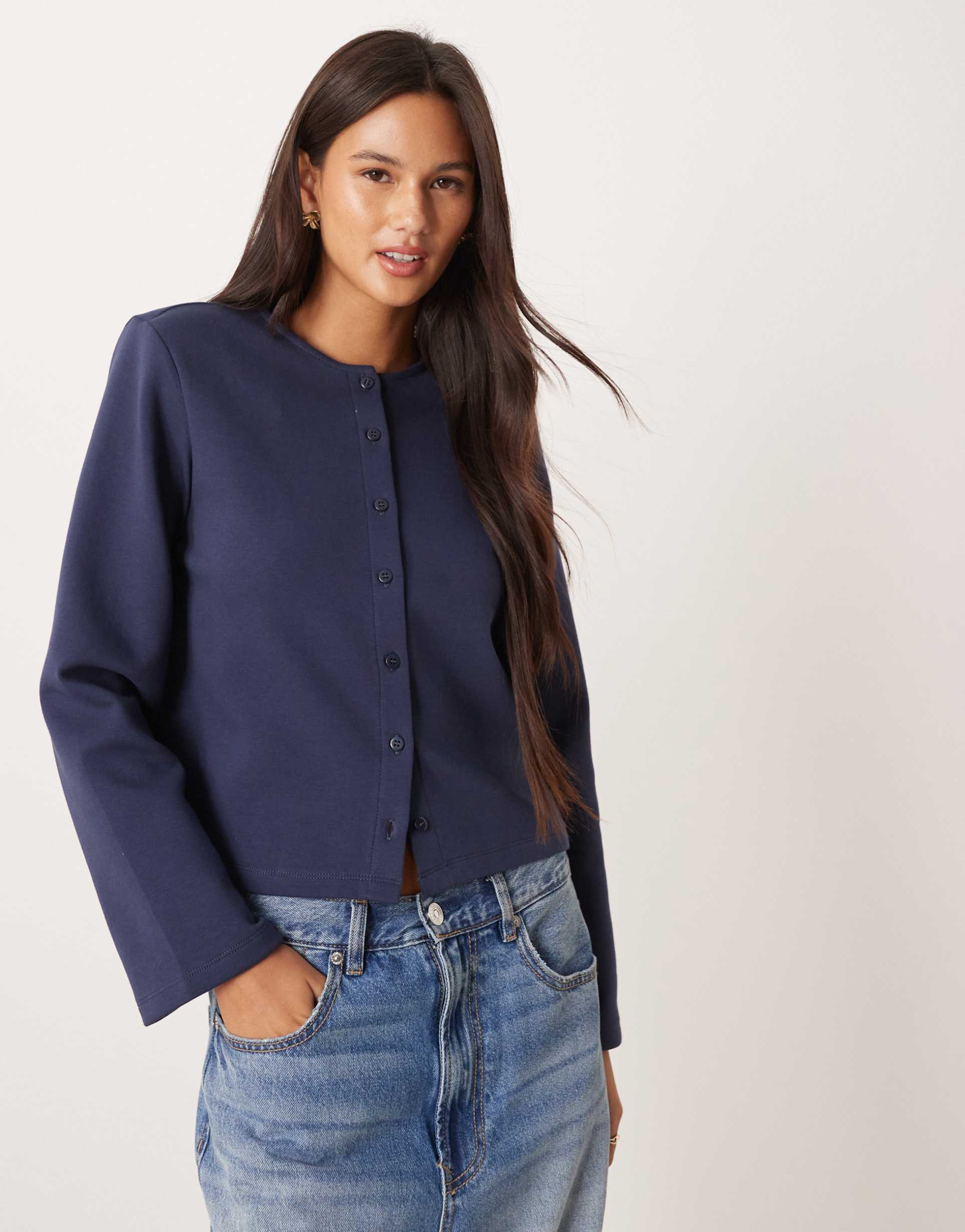 A sophisticated navy button-up top featuring a boxy fit and long sleeves that offer a modern silhouette. Crafted from soft and stretchy cotton interlock knit jersey, it ensures comfort and ease of wear. The round neckline and subtle padded shoulders add a structured, polished touch, making it ideal for casual days, workwear, and business casual settings. Its hip-length cut provides versatility for pairing with jeans or tailored trousers, blending minimalist style with functional elegance for everyday and professional occasions.