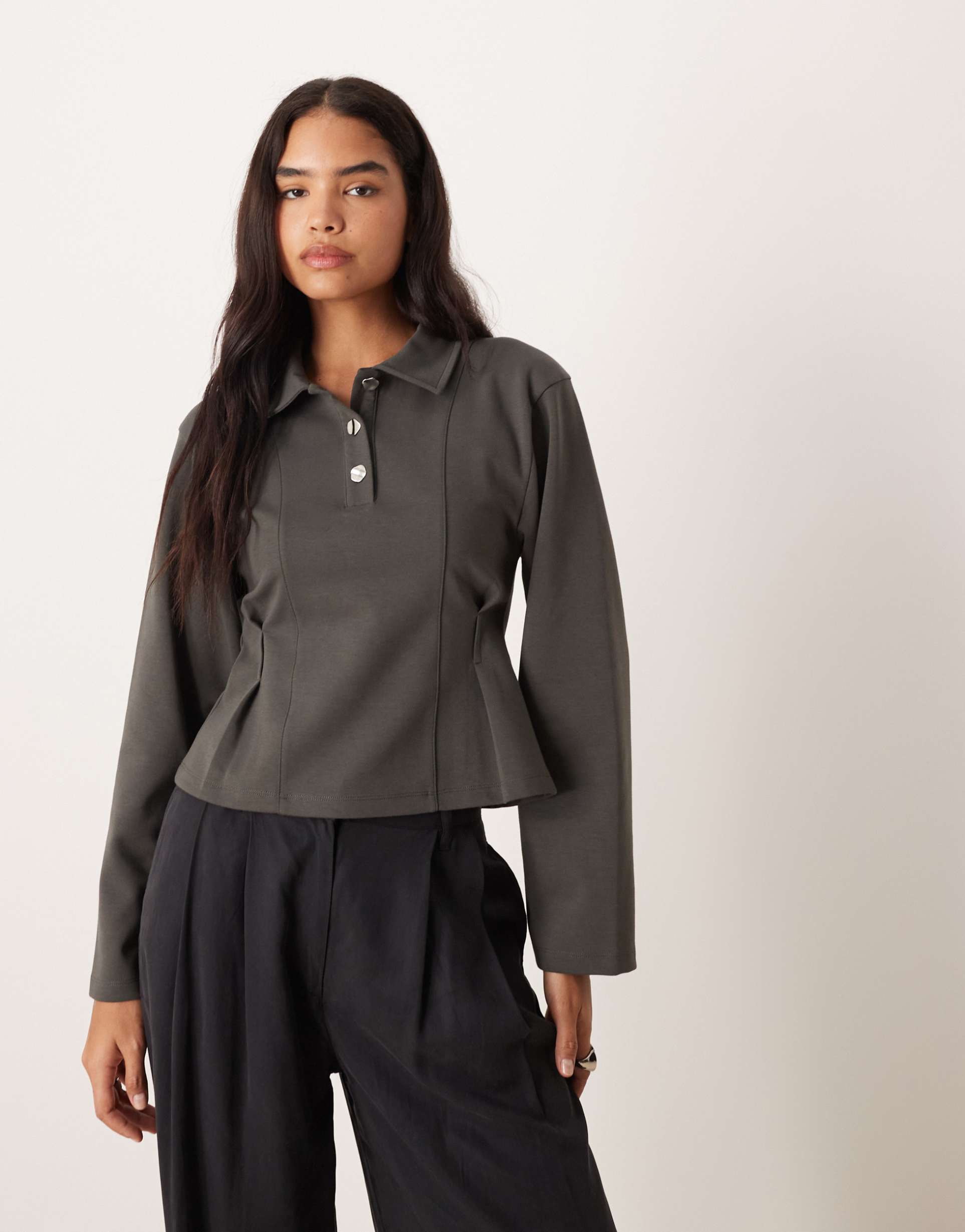 ASOS DESIGN INTERLOCK CINCHED WAIST LONG SLEEVE TOP IN RAVEN