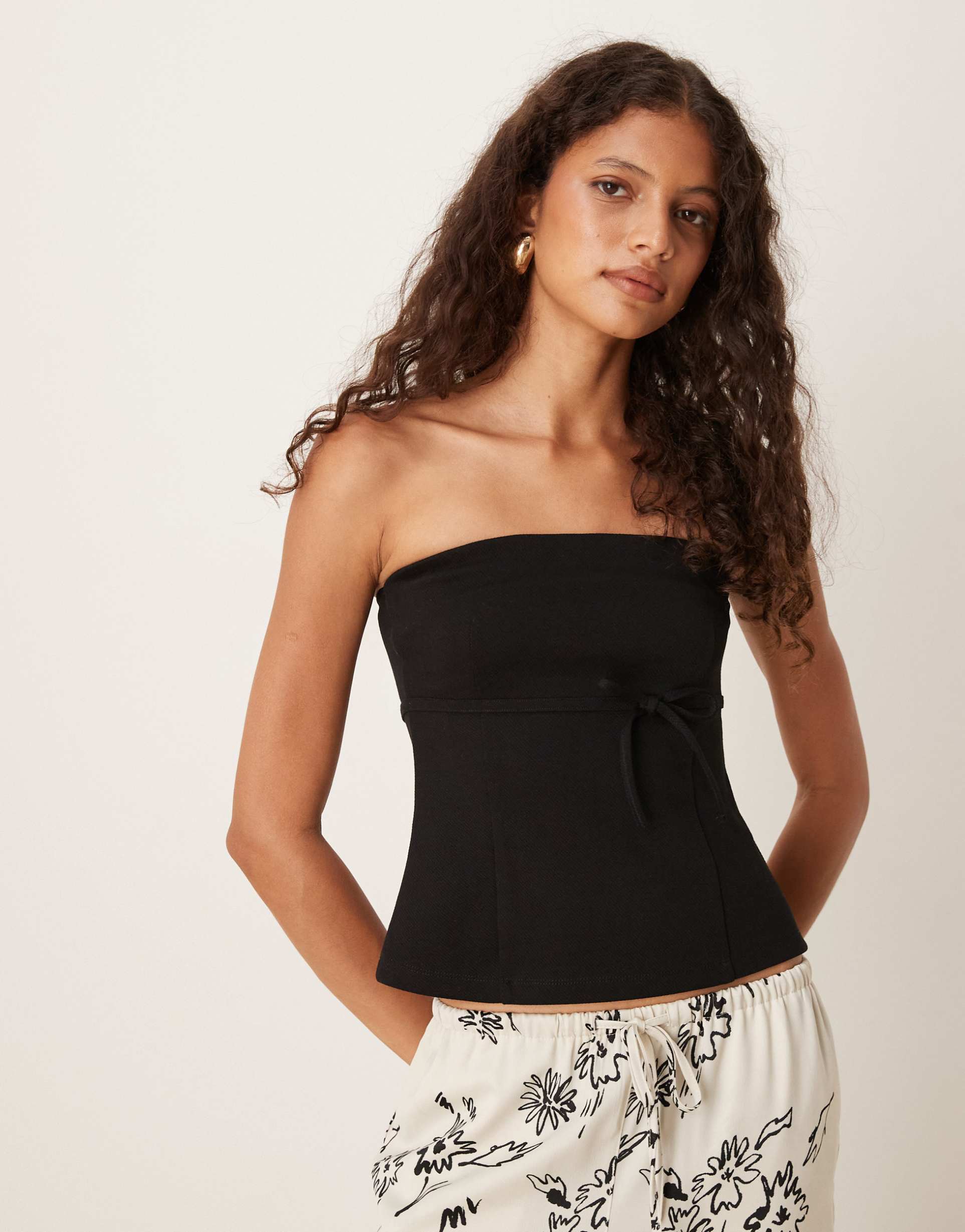 ASOS DESIGN JERSEY TWILL TIE WAIST BANDEAU TOP IN BLACK