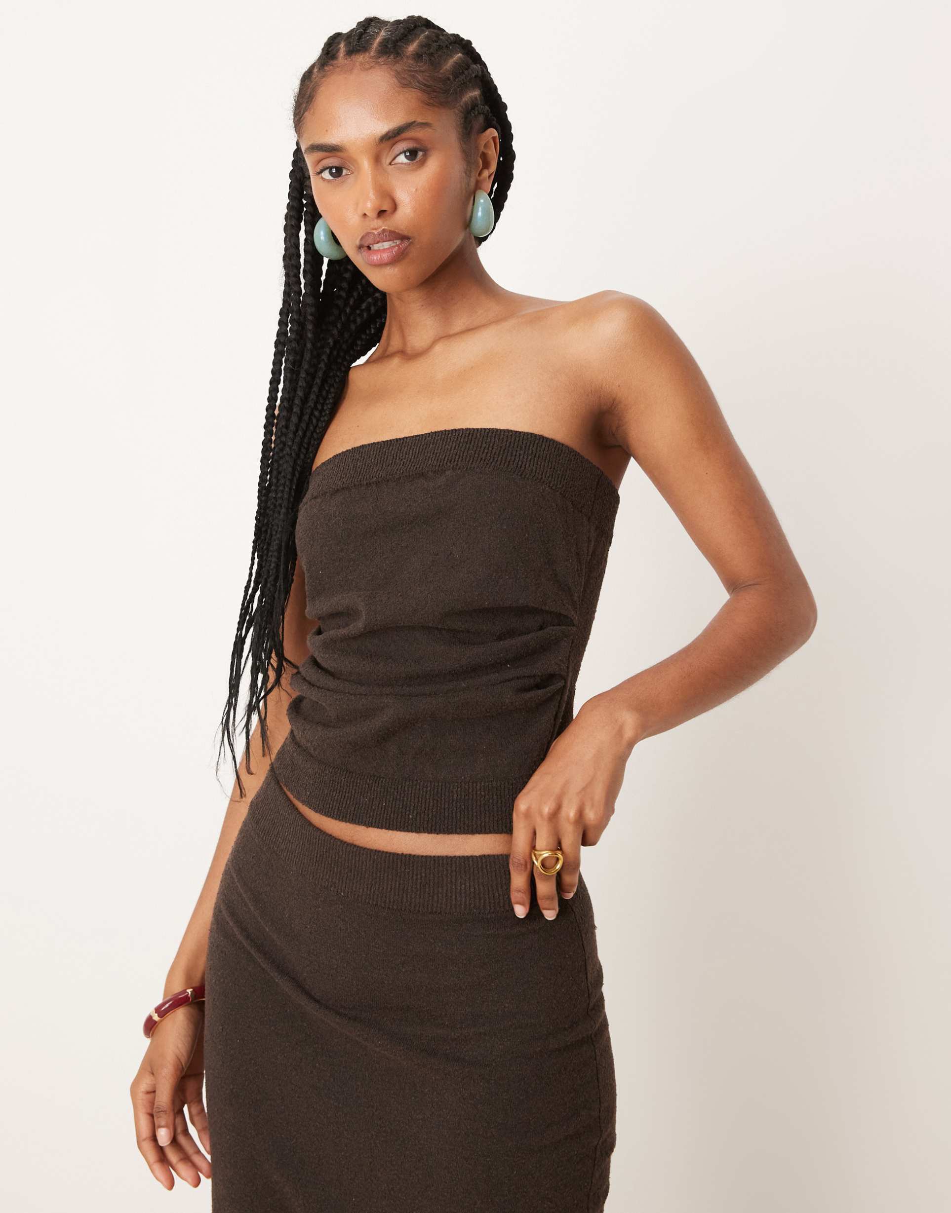 ASOS DESIGN KNIT BOUCLE RUCHED BANDEAU TOP IN CHOCOLATE - PART OF A SET
