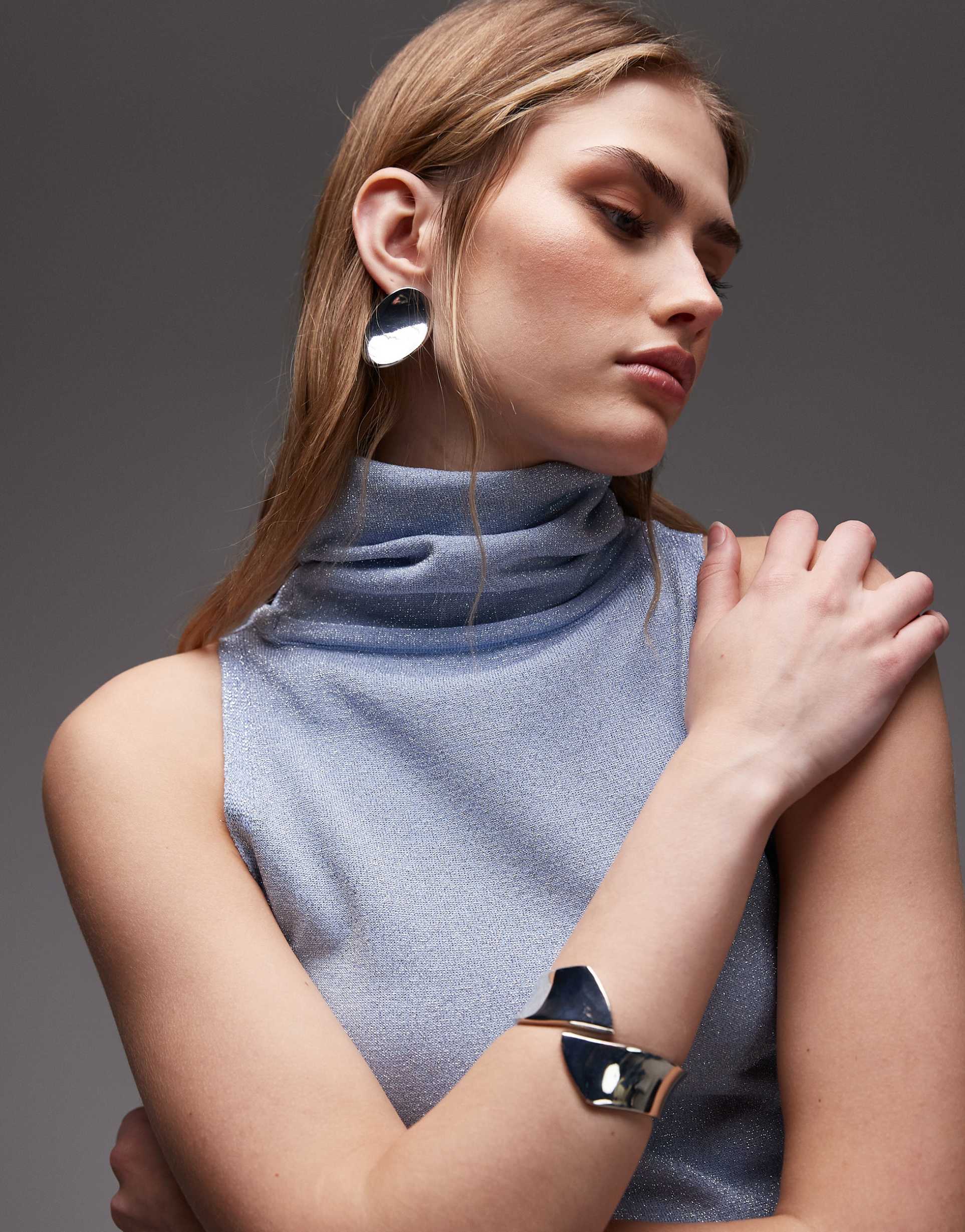 Shimmering baby blue cotton knit crafted into a sleek tank with a chic turtleneck and racerback design. This slim fit, sleeveless top hits at hip length, combining minimalist elegance with a modern touch. Ideal for casual outings, workwear, or brunch dates, its metallic shimmer adds subtle glamour while remaining versatile across spring to autumn seasons.