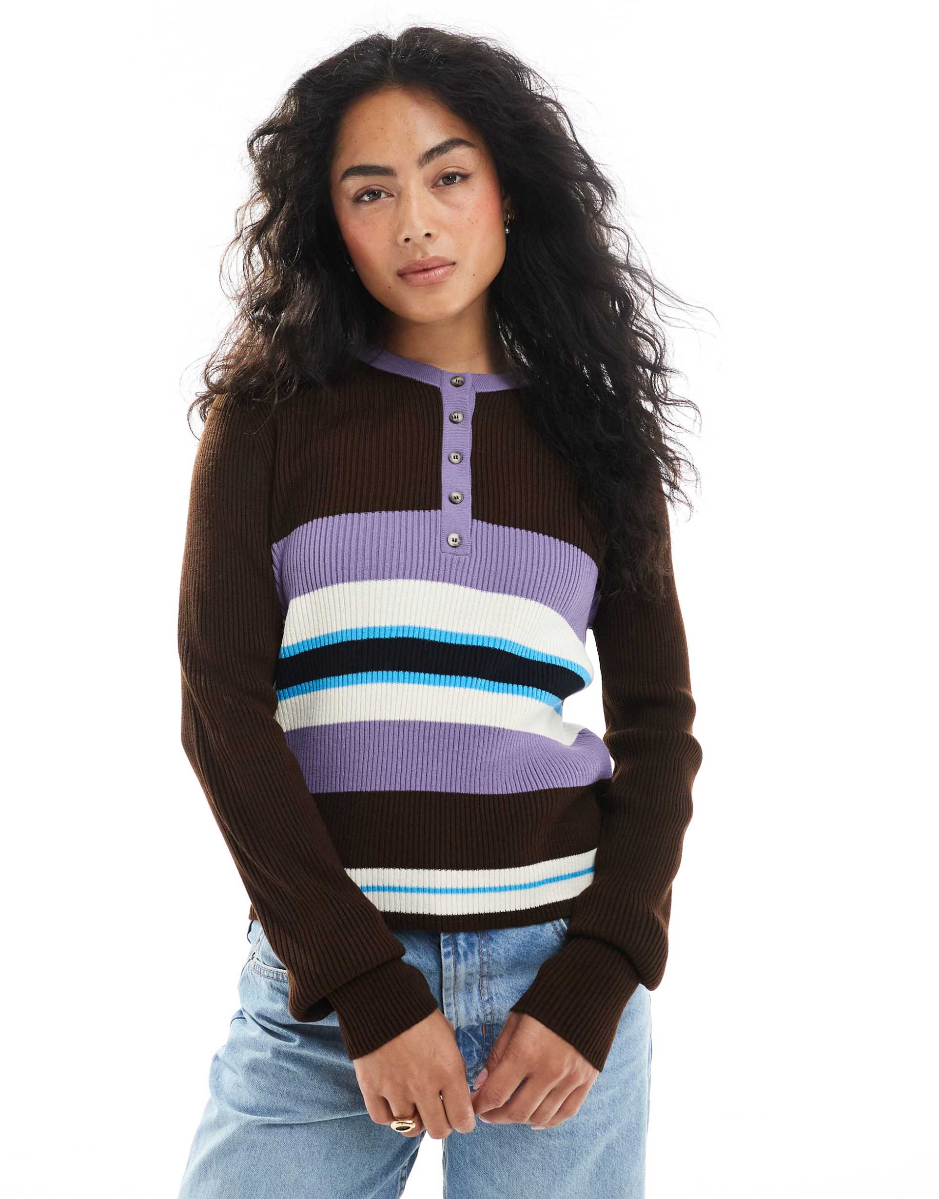 ASOS DESIGN KNIT HENLEY TOP IN BROWN STRIPE