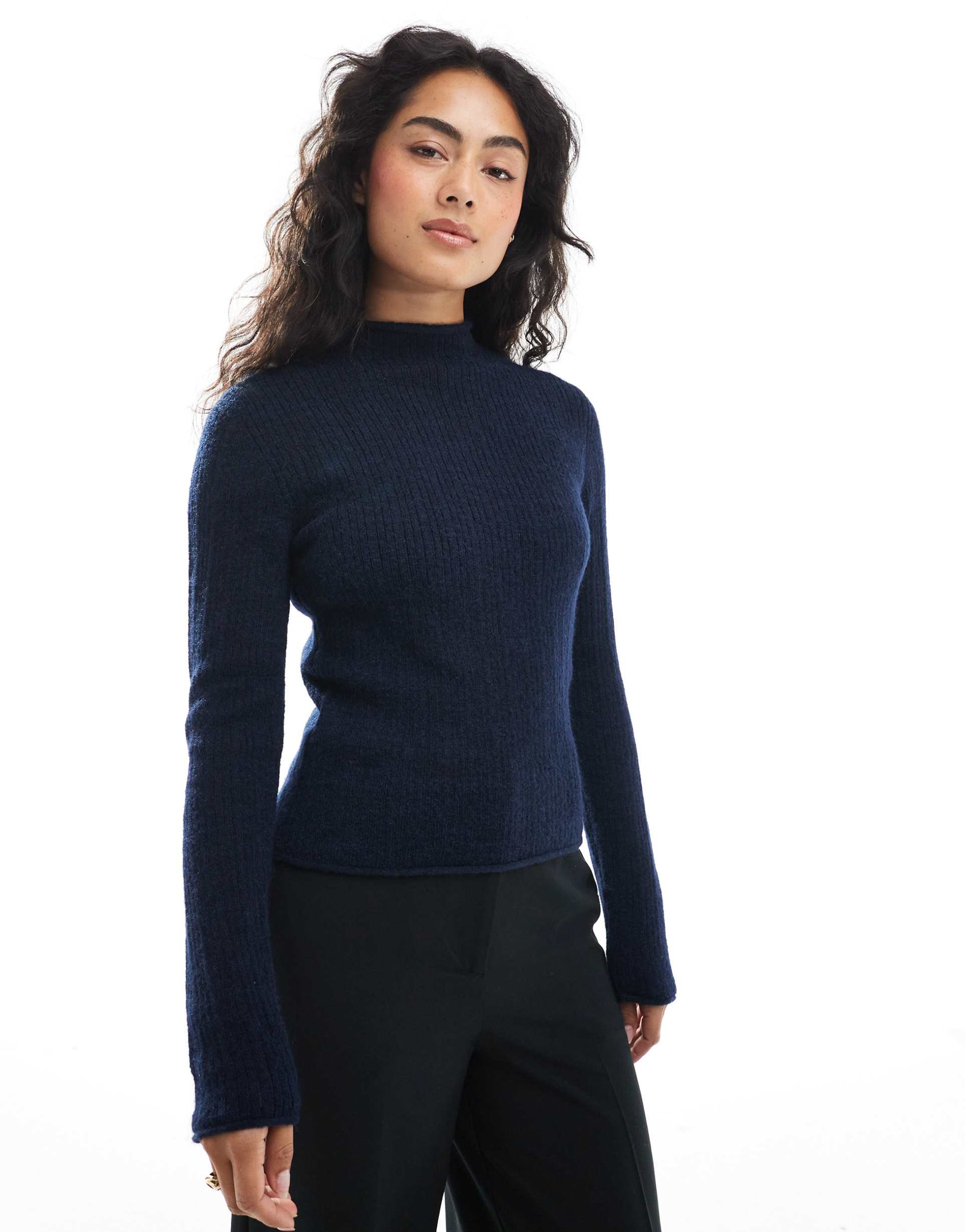 ASOS DESIGN KNIT RIBBED RELAXED FUNNEL NECK TOP IN NAVY