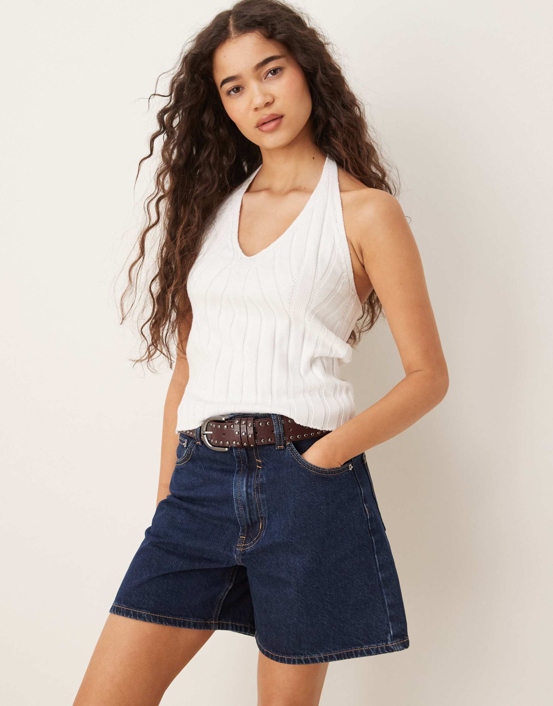 The ASOS DESIGN knit wide rib halter top in crisp white features a slim fit silhouette that flatters the waist length cut. Crafted from a cotton-acrylic blend, this ribbed knit tank offers breathability and texture ideal for spring and summer days. Its halter neck and strapless sleeve styling with a tie-back closure add a minimalist yet chic touch, making it perfect for casual outings, brunch dates, or everyday wear. This versatile piece pairs effortlessly with denim or skirts for an understated, clean look.